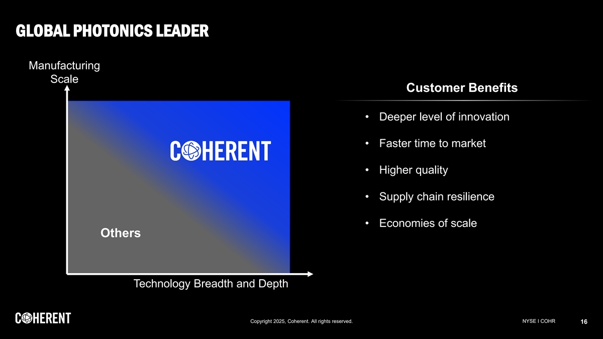 KEY GROWTH DRIVERS: INDUSTRIAL LASERS AND MATERIALS Semi Cap Equipment Display Manufacturing Precision Manufacturing AI Driving Demand for the Most 2X Expansion in Increasing Use of Laser Processes Advanced Nodes OLED Surface Area in Modern Manufacturing Enabled by lasers, optics & materials Our lasers enable annealing Broadest portfolio of solutions Broadest and most advanced portfolio New microLED tool launches this qtr New fiber laser to expand share Copyright 2025, Coherent. All rights reserved. NYSE I COHR 15