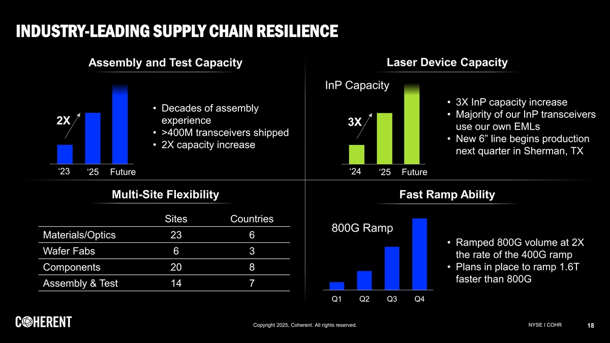 THE INNOVATION PARTNER OF CHOICE Datacenter and Communications Industrial Critical lasers and optics are Key photonic and material technologies are internally designed and manufactured internally designed and manufactured Multigenerational innovation and development partnerships with leading AI cloud providers and the most advanced industrial leaders Copyright 2025, Coherent. All rights reserved. NYSE I COHR 17