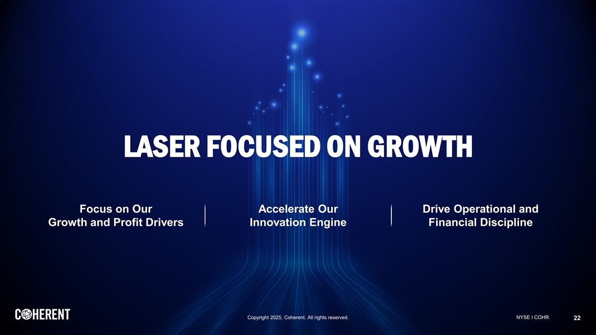 LASER FOCUSED ON GROWTH Focus on Our Accelerate Our Drive Operational and Growth and Profit Drivers Innovation Engine Financial Discipline Copyright 2025, Coherent. All rights reserved. NYSE I COHR 22
