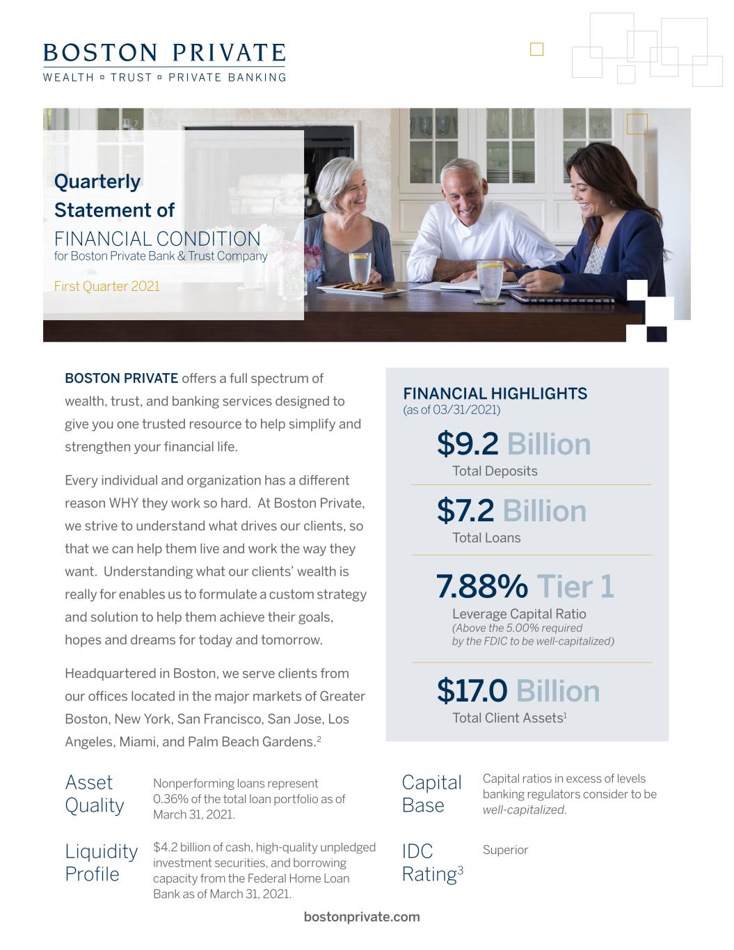 BOSTON PRIVATE offers a full spectrum of wealth, trust, and banking services designed to give you one trusted resource to help simplify and strengthen your financial life. Every individual and organization has a different reason WHY they work so hard. At Boston Private, we strive to understand what drives our clients, so that we can help them live and work the way they want. Understanding what our clients’ wealth is really for enables us to formulate a custom strategy and solution to help them achieve their goals, hopes and dreams for today and tomorrow. Headquartered in Boston, we serve clients from our offices located in the major markets of Greater Boston, New York, San Francisco, San Jose, Los Angeles, Miami, and Palm Beach Gardens.2 bostonprivate.com Quarterly Statement of FINANCIAL CONDITION for Boston Private Bank & Trust Company FINANCIAL HIGHLIGHTS First Quarter 2021 $9.2 Billion Total Deposits $17.0 Billion Total Client Assets1 7.88% Tier 1 Leverage Capital Ratio (Above the 5.00% required by the FDIC to be well-capitalized) $7.2 Billion Total Loans $4.2 billion of cash, high-quality unpledged investment securities, and borrowing capacity from the Federal Home Loan Bank as of March 31, 2021. Capital Base Asset Quality Nonperforming loans represent 0.36% of the total loan portfolio as of March 31, 2021. Capital ratios in excess of levels banking regulators consider to be well-capitalized. Liquidity Profile IDC Rating3 Superior (as of 03/31/2021)