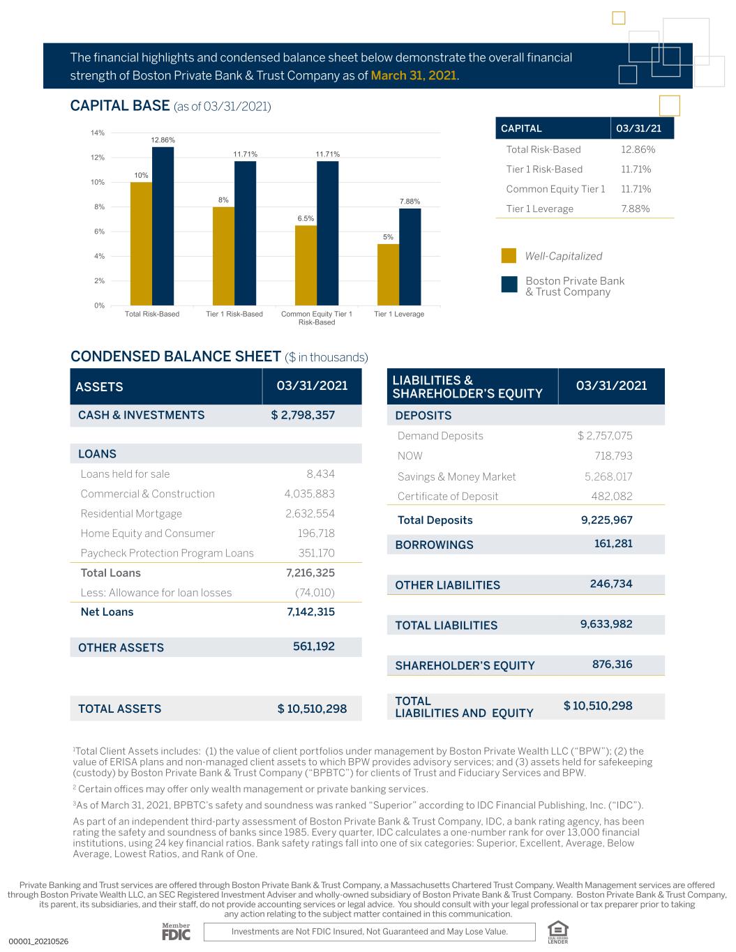 Private Banking and Trust services are o ered through Boston Private Bank & Trust Company, a Massachusetts Chartered Trust Company. Wealth Management services are o ered through Boston Private Wealth LLC, an SEC Registered Investment Adviser and wholly-owned subsidiary of Boston Private Bank & Trust Company. Boston Private Bank & Trust Company, its parent, its subsidiaries, and their sta , do not provide accounting services or legal advice. You should consult with your legal professional or tax preparer prior to taking any action relating to the subject matter contained in this communication. Investments are Not FDIC Insured, Not Guaranteed and May Lose Value. 10% 8% 6.5% 5% 12.86% 11.71% 11.71% 7.88% 0% 2% 4% 6% 8% 10% 12% 14% Total Risk-Based Tier 1 Risk-Based Common Equity Tier 1 Risk-Based Tier 1 Leverage CAPITAL 03/31/21 Total Risk-Based 12.86% Tier 1 Risk-Based 11.71% Common Equity Tier 1 11.71% Tier 1 Leverage 7.88% Well-Capitalized Boston Private Bank & Trust Company CAPITAL BASE (as of 03/31/2021) The financial highlights and condensed balance sheet below demonstrate the overall financial strength of Boston Private Bank & Trust Company as of March 31, 2021. CONDENSED BALANCE SHEET ($ in thousands) ASSETS 03/31/2021 CASH & INVESTMENTS $ 2,798,357 LOANS Loans held for sale 8,434 Commercial & Construction 4,035,883 Residential Mortgage 2,632,554 Home Equity and Consumer 196,718 Paycheck Protection Program Loans 351,170 Total Loans 7,216,325 Less: Allowance for loan losses (74,010) Net Loans 7,142,315 OTHER ASSETS 561,192 TOTAL ASSETS $ 10,510,298 LIABILITIES & SHAREHOLDER’S EQUITY 03/31/2021 DEPOSITS Demand Deposits $ 2,757,075 NOW 718,793 Savings & Money Market 5,268,017 Certificate of Deposit 482,082 Total Deposits 9,225,967 BORROWINGS 161,281 OTHER LIABILITIES 246,734 TOTAL LIABILITIES 9,633,982 SHAREHOLDER’S EQUITY 876,316 TOTAL LIABILITIES AND EQUITY $ 10,510,298 1Total Client Assets includes: (1) the value of client portfolios under management by Boston Private Wealth LLC (“BPW”); (2) the value of ERISA plans and non-managed client assets to which BPW provides advisory services; and (3) assets held for safekeeping (custody) by Boston Private Bank & Trust Company (“BPBTC”) for clients of Trust and Fiduciary Services and BPW. 2 Certain offices may offer only wealth management or private banking services. 3As of March 31, 2021, BPBTC’s safety and soundness was ranked “Superior” according to IDC Financial Publishing, Inc. (“IDC”). As part of an independent third-party assessment of Boston Private Bank & Trust Company, IDC, a bank rating agency, has been rating the safety and soundness of banks since 1985. Every quarter, IDC calculates a one-number rank for over 13,000 financial institutions, using 24 key financial ratios. Bank safety ratings fall into one of six categories: Superior, Excellent, Average, Below Average, Lowest Ratios, and Rank of One. 00001_20210526