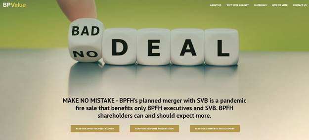 “The dissident points to DeChellis' employment agreement with SIVB and the significant retention bonuses to other BPFH executives as evidence that BPFH favored SIVB as a potential acquiror. While the board has stated that negotiations with SIVB were led by Chairman Waters and independent director Furlong, the presence of DeChellis throughout the negotiations raises doubts that could have been avoided had the board created a committee of disinterested directors to lead negotiations.”