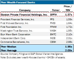 As of yesterday’s close, BPFH is the lowest valued bank of its self-identified wealth-focused peer group2 (excluding banks greater than $40 billion of assets), even after including the so-called “premium” from SVB: