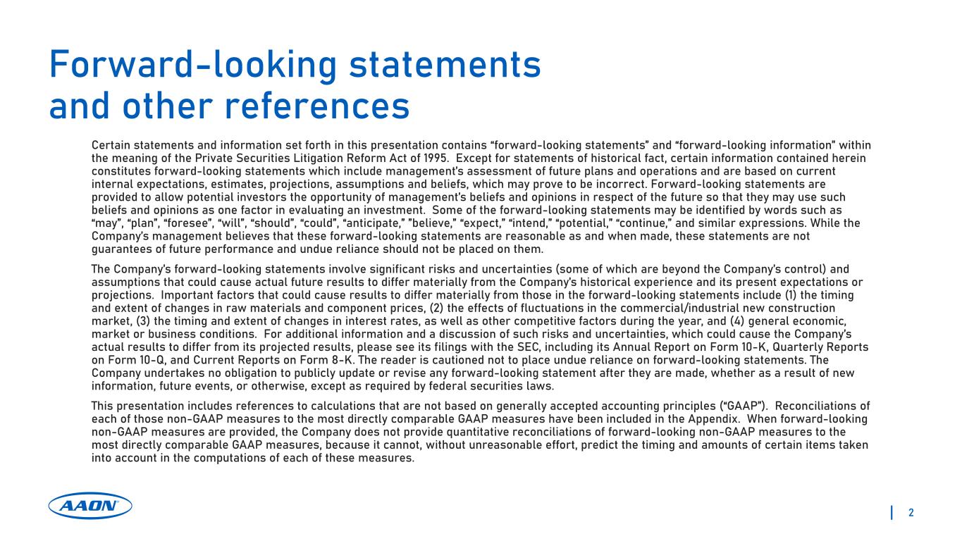 Forward-looking statements and other references Certain statements and information set forth in this presentation contains “forward-looking statements” and “forward-looking information” within the meaning of the Private Securities Litigation Reform Act of 1995. Except for statements of historical fact, certain information contained herein constitutes forward-looking statements which include management’s assessment of future plans and operations and are based on current internal expectations, estimates, projections, assumptions and beliefs, which may prove to be incorrect. Forward-looking statements are provided to allow potential investors the opportunity of management’s beliefs and opinions in respect of the future so that they may use such beliefs and opinions as one factor in evaluating an investment. Some of the forward-looking statements may be identified by words such as “may”, “plan”, “foresee”, “will”, “should”, “could”, “anticipate,” ”believe,” “expect,” “intend,” “potential,” “continue,” and similar expressions. While the Company’s management believes that these forward-looking statements are reasonable as and when made, these statements are not guarantees of future performance and undue reliance should not be placed on them. The Company’s forward-looking statements involve significant risks and uncertainties (some of which are beyond the Company’s control) and assumptions that could cause actual future results to differ materially from the Company’s historical experience and its present expectations or projections. Important factors that could cause results to differ materially from those in the forward-looking statements include (1) the timing and extent of changes in raw materials and component prices, (2) the effects of fluctuations in the commercial/industrial new construction market, (3) the timing and extent of changes in interest rates, as well as other competitive factors during the year, and (4) general economic, market or business conditions. For additional information and a discussion of such risks and uncertainties, which could cause the Company’s actual results to differ from its projected results, please see its filings with the SEC, including its Annual Report on Form 10-K, Quarterly Reports on Form 10-Q, and Current Reports on Form 8-K. The reader is cautioned not to place undue reliance on forward-looking statements. The Company undertakes no obligation to publicly update or revise any forward-looking statement after they are made, whether as a result of new information, future events, or otherwise, except as required by federal securities laws. This presentation includes references to calculations that are not based on generally accepted accounting principles (“GAAP”). Reconciliations of each of those non-GAAP measures to the most directly comparable GAAP measures have been included in the Appendix. When forward-looking non-GAAP measures are provided, the Company does not provide quantitative reconciliations of forward-looking non-GAAP measures to the most directly comparable GAAP measures, because it cannot, without unreasonable effort, predict the timing and amounts of certain items taken into account in the computations of each of these measures. 2