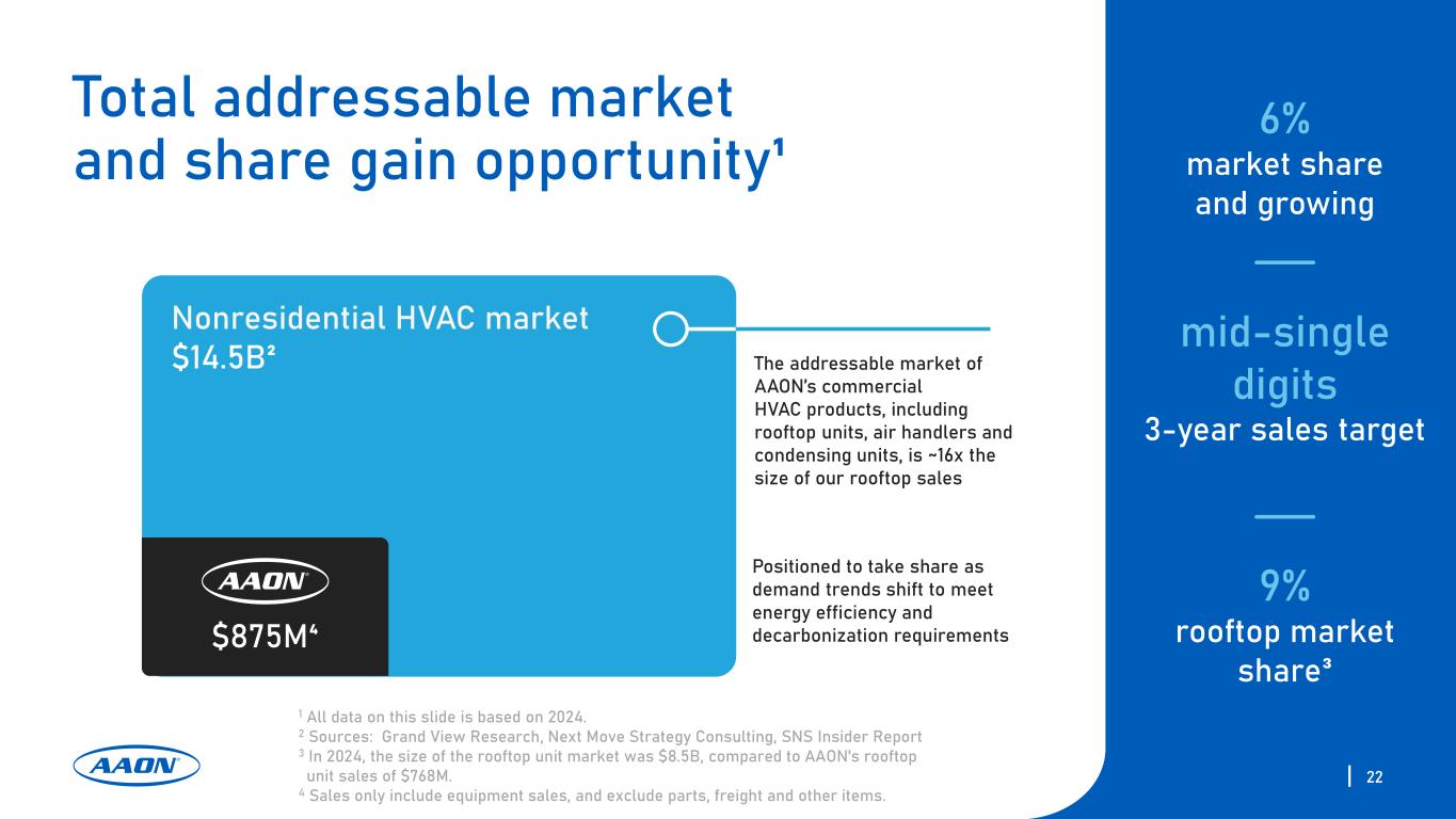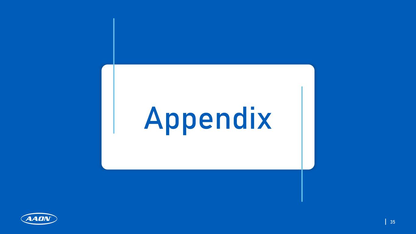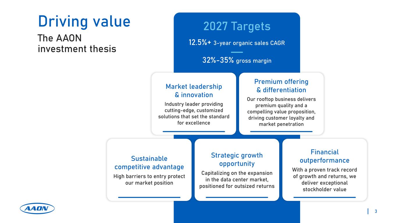 Driving value The AAON investment thesis 2027 Targets Sustainable competitive advantage High barriers to entry protect our market position Strategic growth opportunity Capitalizing on the expansion in the data center market, positioned for outsized returns Financial outperformance With a proven track record of growth and returns, we deliver exceptional stockholder value Market leadership & innovation Industry leader providing cutting-edge, customized solutions that set the standard for excellence Premium offering & differentiation Our rooftop business delivers premium quality and a compelling value proposition, driving customer loyalty and market penetration 12.5%+ 3-year organic sales CAGR 32%-35% gross margin 3