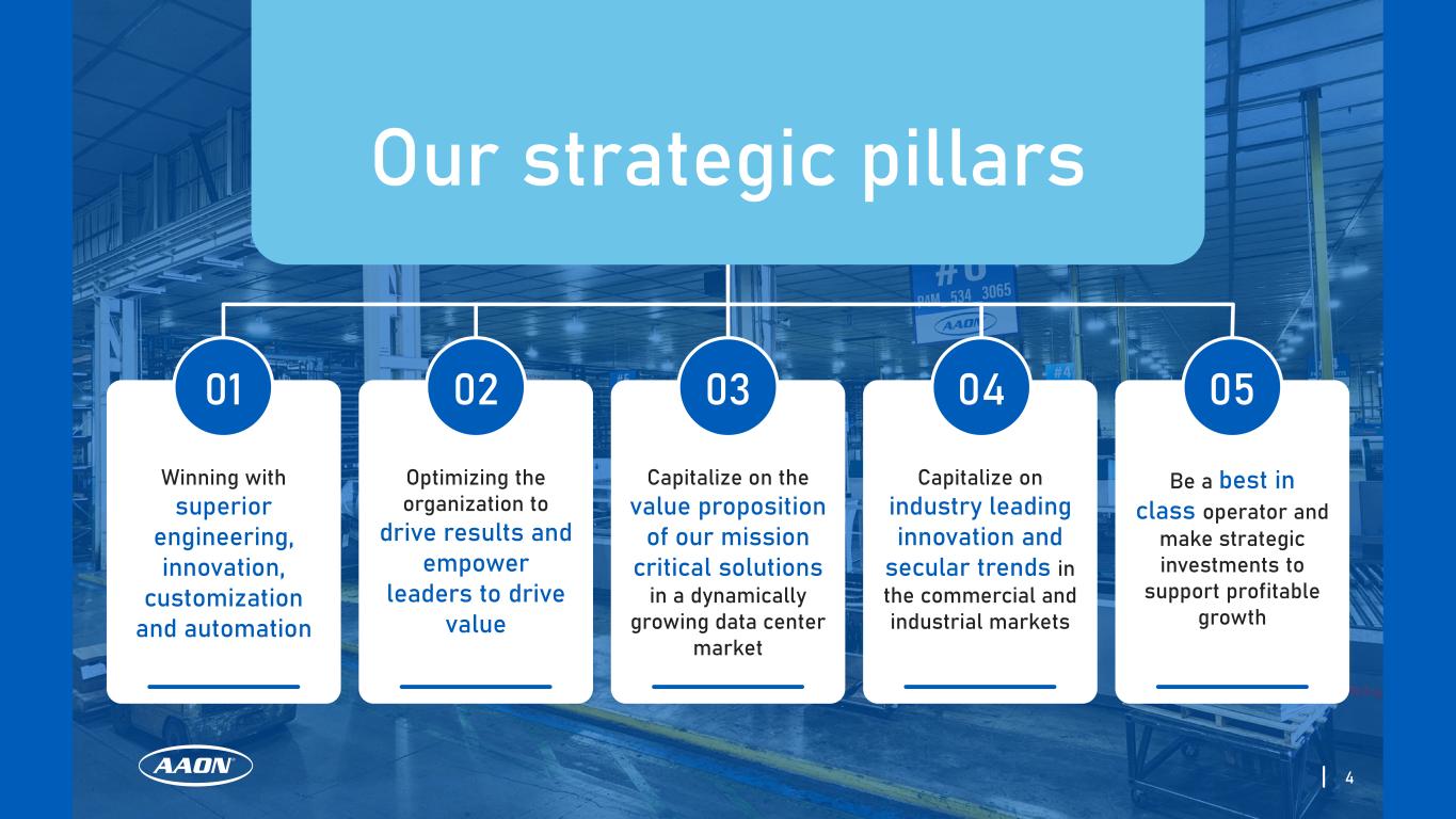 Our strategic pillars Winning with superior engineering, innovation, customization and automation Optimizing the organization to drive results and empower leaders to drive value Capitalize on the value proposition of our mission critical solutions in a dynamically growing data center market Capitalize on industry leading innovation and secular trends in the commercial and industrial markets Be a best in class operator and make strategic investments to support profitable growth 02 03 04 0501 4