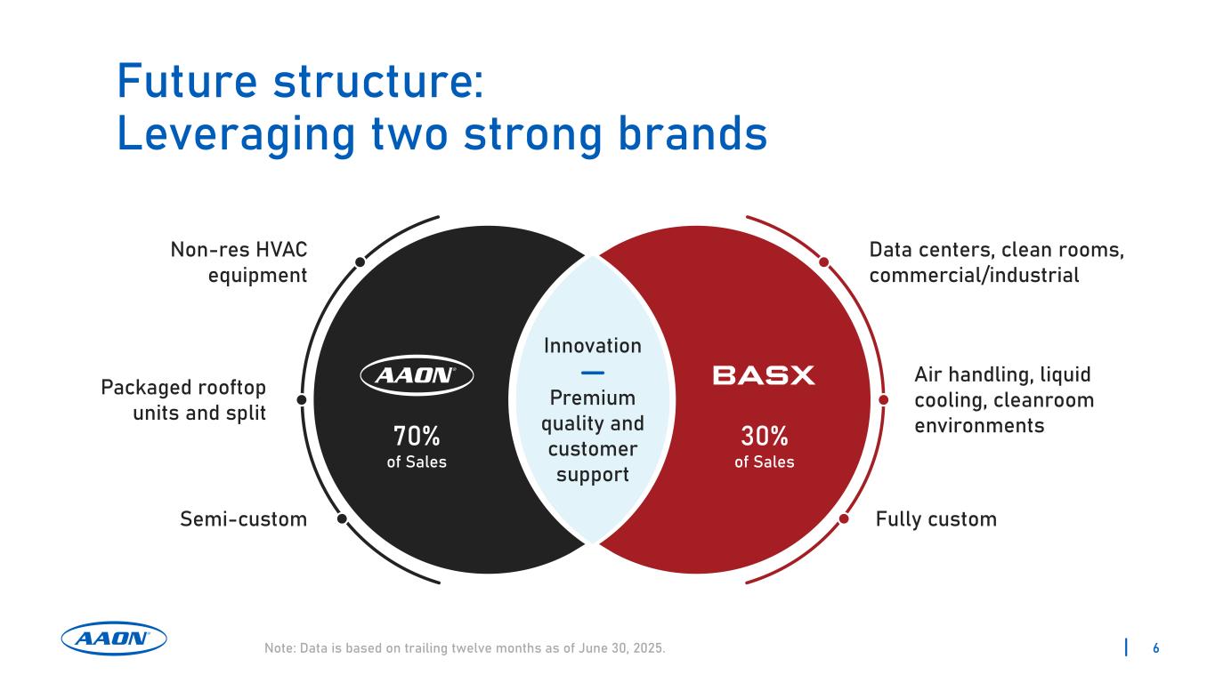 AAON: an overview 1 Adjusted for replacement purchase orders received in July related to administrative processing. Note: All data is based on trailing twelve months as of June 30, 2025. See Non-GAAP Financial Measures in Appendix. 5 �1.1B Order backlog1 28.7% Gross margin 18.1% EBITDA margin 22.5% CapEx and R&D as a percent of sales �1.47 EPS 11.9% ROIC Sales by branded productsBASX Sales by segment AAON Oklahoma AAON Coil Products AAON U.S. Sales by region International BASX