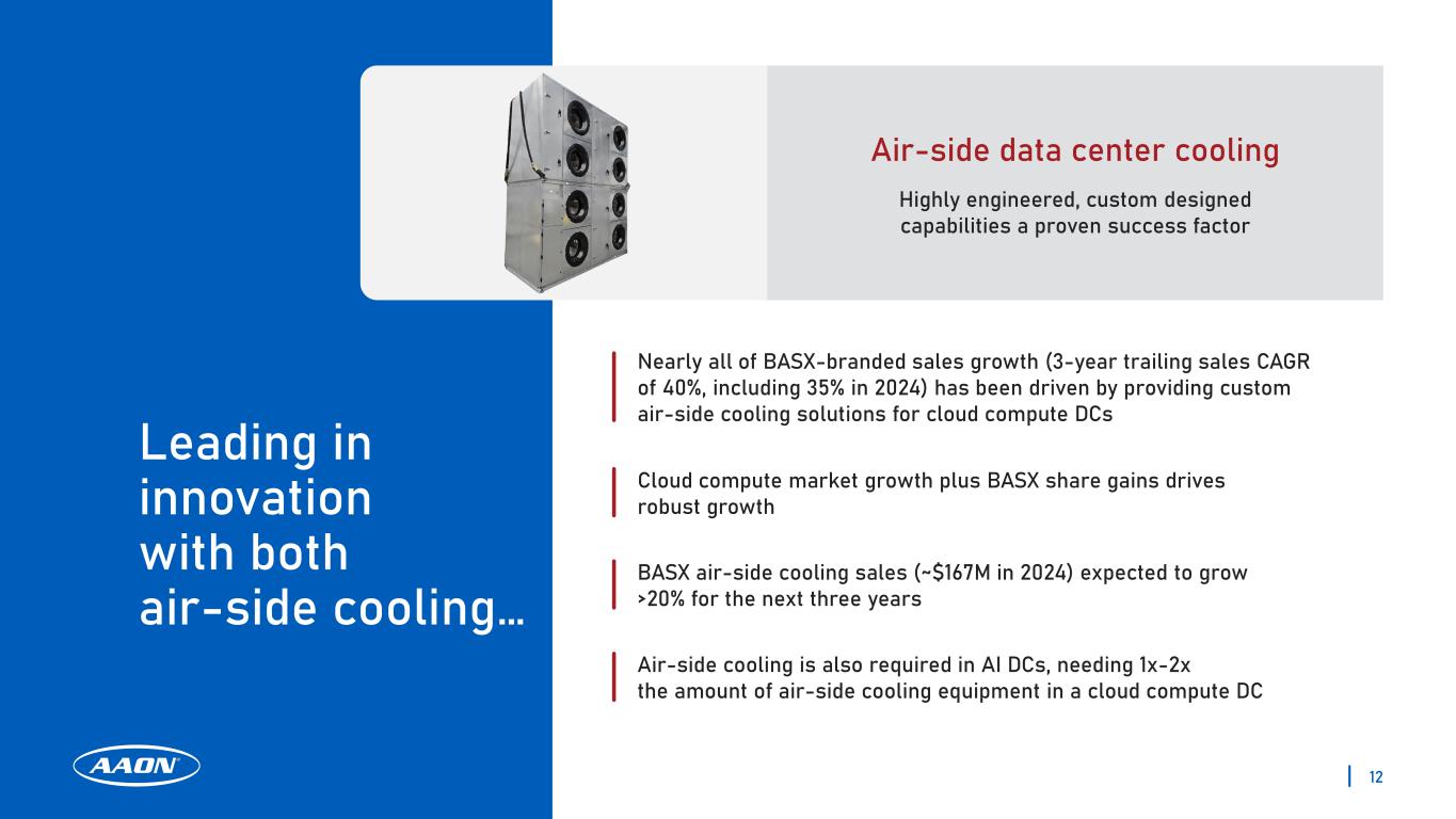 BASX product offerings provide end-to-end solution for data centers opportunity is ~�1.0B - �1.5B per GW1 Computer Room Air Handler Air Handling Units Free Cooling Heat Rejection Chiller Coolant Distribution Unit Overhead Fan Coil Fan Coil Wall 1 Note: Opportunity is based on full utilization of manufacturing square footage of 980,000 sq. ft. 11