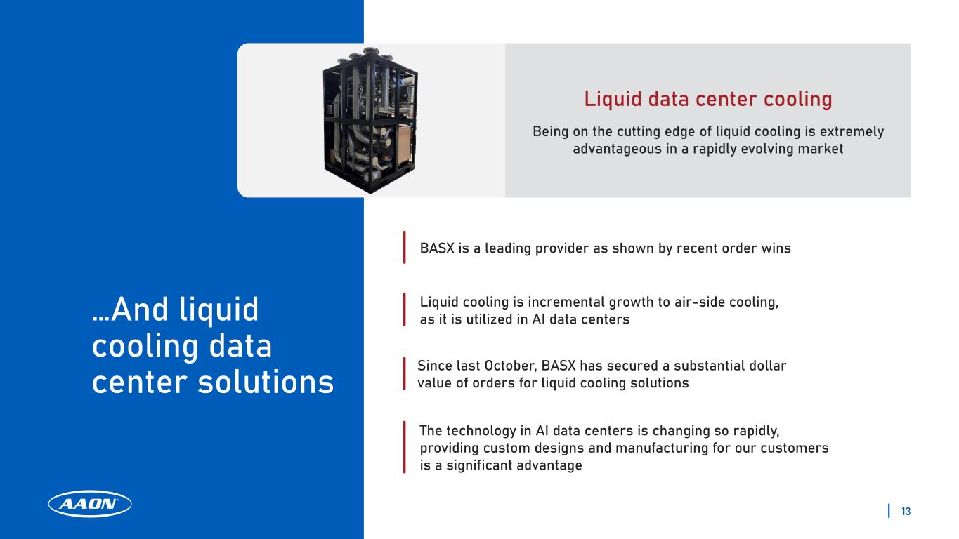 Air-side data center cooling Highly engineered, custom designed capabilities a proven success factor Leading in innovation with both air-side cooling… Cloud compute market growth plus BASX share gains drives robust growth Nearly all of BASX-branded sales growth (3-year trailing sales CAGR of 40%, including 35% in 2024) has been driven by providing custom air-side cooling solutions for cloud compute DCs BASX air-side cooling sales (~�167M in 2024) expected to grow >20% for the next three years Air-side cooling is also required in AI DCs, needing 1x-2x the amount of air-side cooling equipment in a cloud compute DC 12