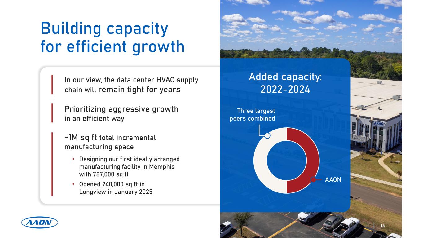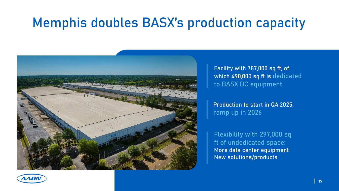 Building capacity for efficient growth AAON Three largest peers combined Added capacity: 2022-2024 ~1M sq ft total incremental manufacturing space • Designing our first ideally arranged manufacturing facility in Memphis with 787,000 sq ft • Opened 240,000 sq ft in Longview in January 2025 Prioritizing aggressive growth in an efficient way In our view, the data center HVAC supply chain will remain tight for years 14