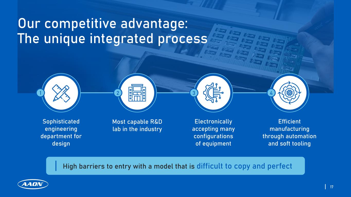 What makes the AAON brand special? Innovation and engineering Leading in innovation and engineering is at AAON's core, and it enables us to fully support all our customers Semi-custom engineering & manufacturing A proprietary, hard-to-replicate process that seamlessly integrates deep customization within a highly automated production environment Performance and energy efficiency Innovations such as DOAS (dedicated outdoor air systems) and advanced heat pump capabilities have contributed to leading the industry in quality and performance Built for application A highly configurable product line allows customers to fit- for-purpose, which maximizes performance and efficiency 16