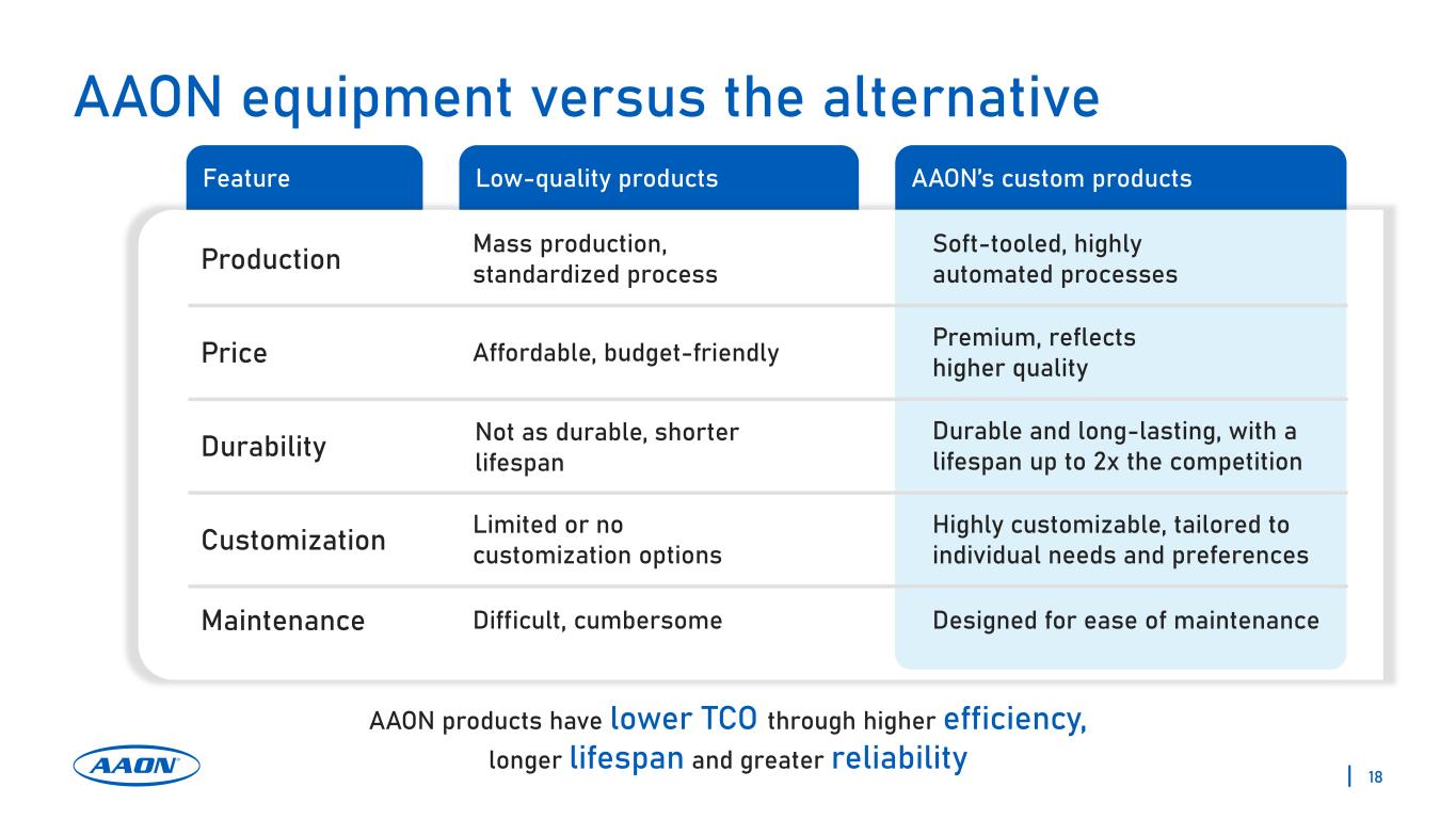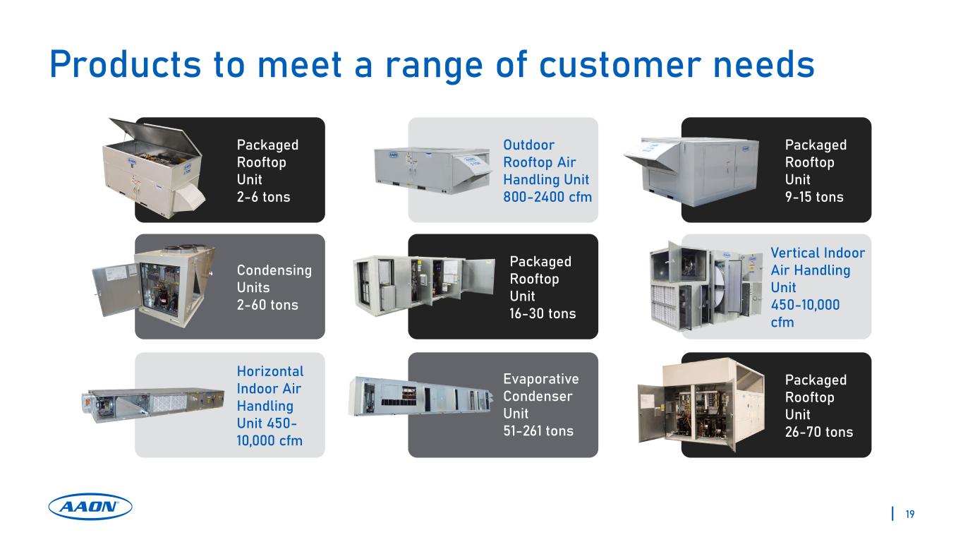 Feature AAON’s custom productsLow-quality products AAON equipment versus the alternative Production Soft-tooled, highly automated processes Price Premium, reflects higher quality Durability Durable and long-lasting, with a lifespan up to 2x the competition Customization Highly customizable, tailored to individual needs and preferences Maintenance Mass production, standardized process Affordable, budget-friendly Not as durable, shorter lifespan Limited or no customization options Difficult, cumbersome Designed for ease of maintenance AAON products have lower TCO through higher efficiency, longer lifespan and greater reliability 18