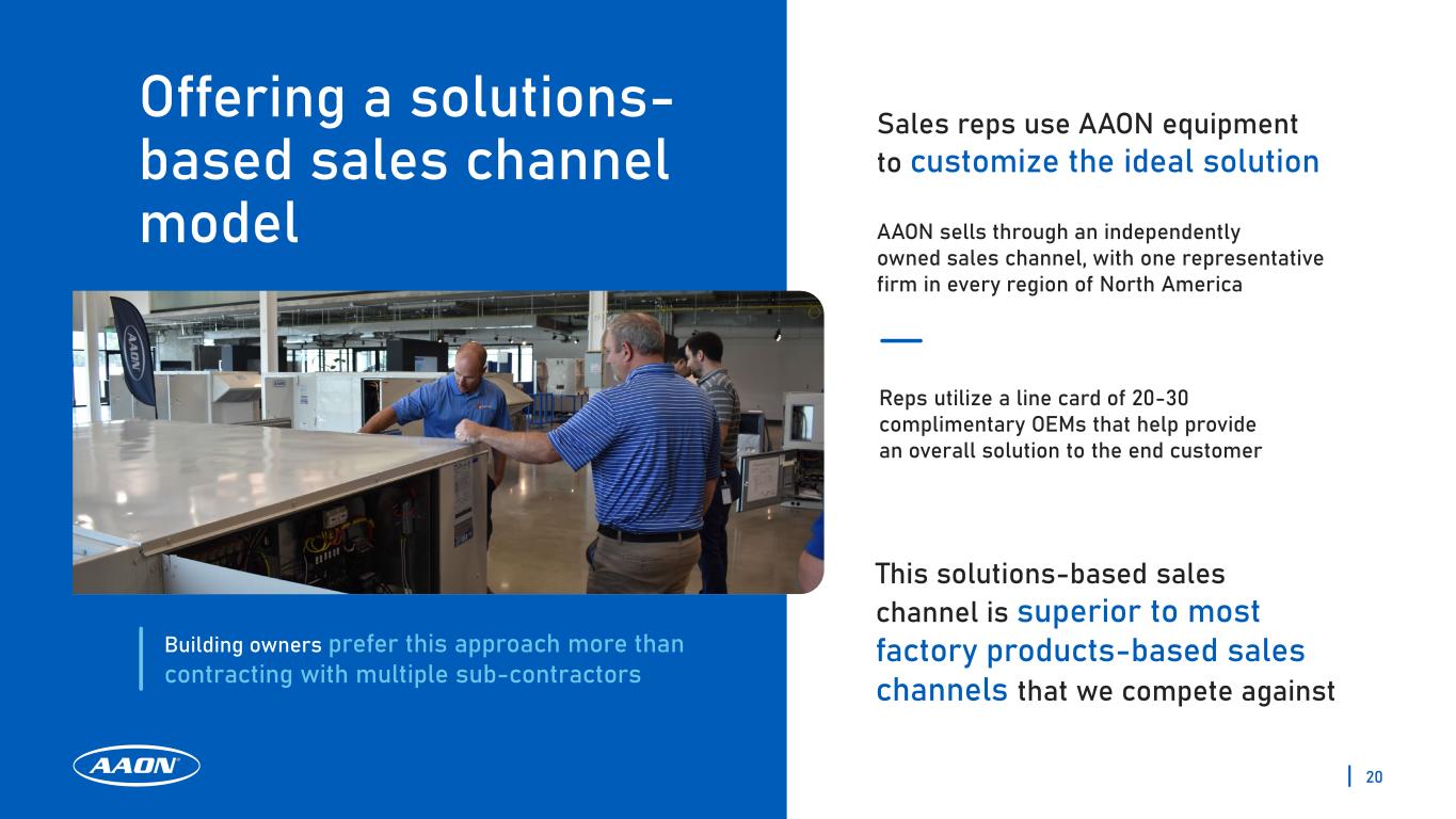 Offering a solutions- based sales channel model Building owners prefer this approach more than contracting with multiple sub-contractors Sales reps use AAON equipment to customize the ideal solution This solutions-based sales channel is superior to most factory products-based sales channels that we compete against AAON sells through an independently owned sales channel, with one representative firm in every region of North America Reps utilize a line card of 20-30 complimentary OEMs that help provide an overall solution to the end customer 20