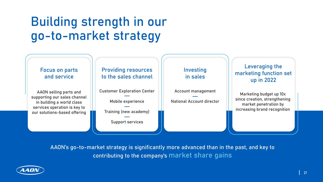 Building strength in our go-to-market strategy Focus on parts and service AAON selling parts and supporting our sales channel in building a world class services operation is key to our solutions-based offering Leveraging the marketing function set up in 2022 Marketing budget up 10x since creation, strengthening market penetration by increasing brand recognition AAON’s go-to-market strategy is significantly more advanced than in the past, and key to contributing to the company’s market share gains Providing resources to the sales channel Customer Exploration Center Support services Training (new academy) Mobile experience Investing in sales Account management National Account director 21