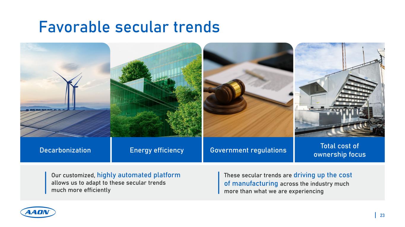 Favorable secular trends Decarbonization Energy efficiency Government regulations Total cost of ownership focus Our customized, highly automated platform allows us to adapt to these secular trends much more efficiently These secular trends are driving up the cost of manufacturing across the industry much more than what we are experiencing 23