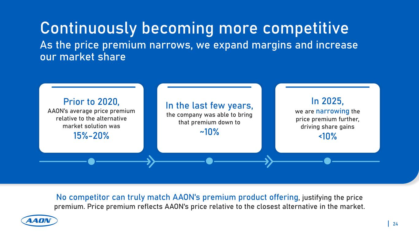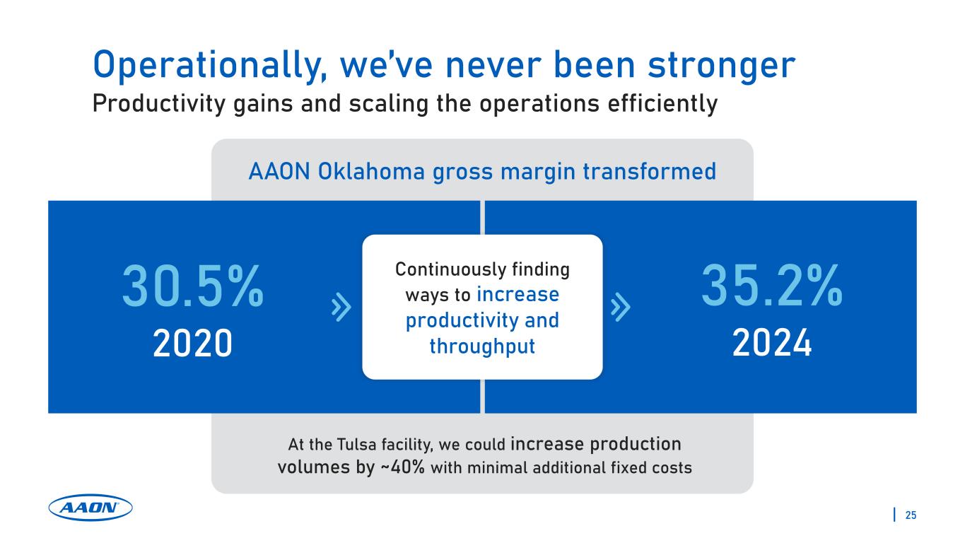 Continuously becoming more competitive As the price premium narrows, we expand margins and increase our market share Prior to 2020, AAON’s average price premium relative to the alternative market solution was 15%-20% In the last few years, the company was able to bring that premium down to ~10% In 2025, we are narrowing the price premium further, driving share gains <10% No competitor can truly match AAON's premium product offering, justifying the price premium. Price premium reflects AAON's price relative to the closest alternative in the market. 24