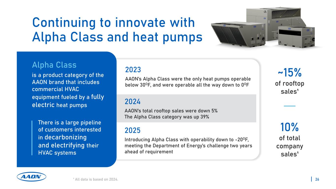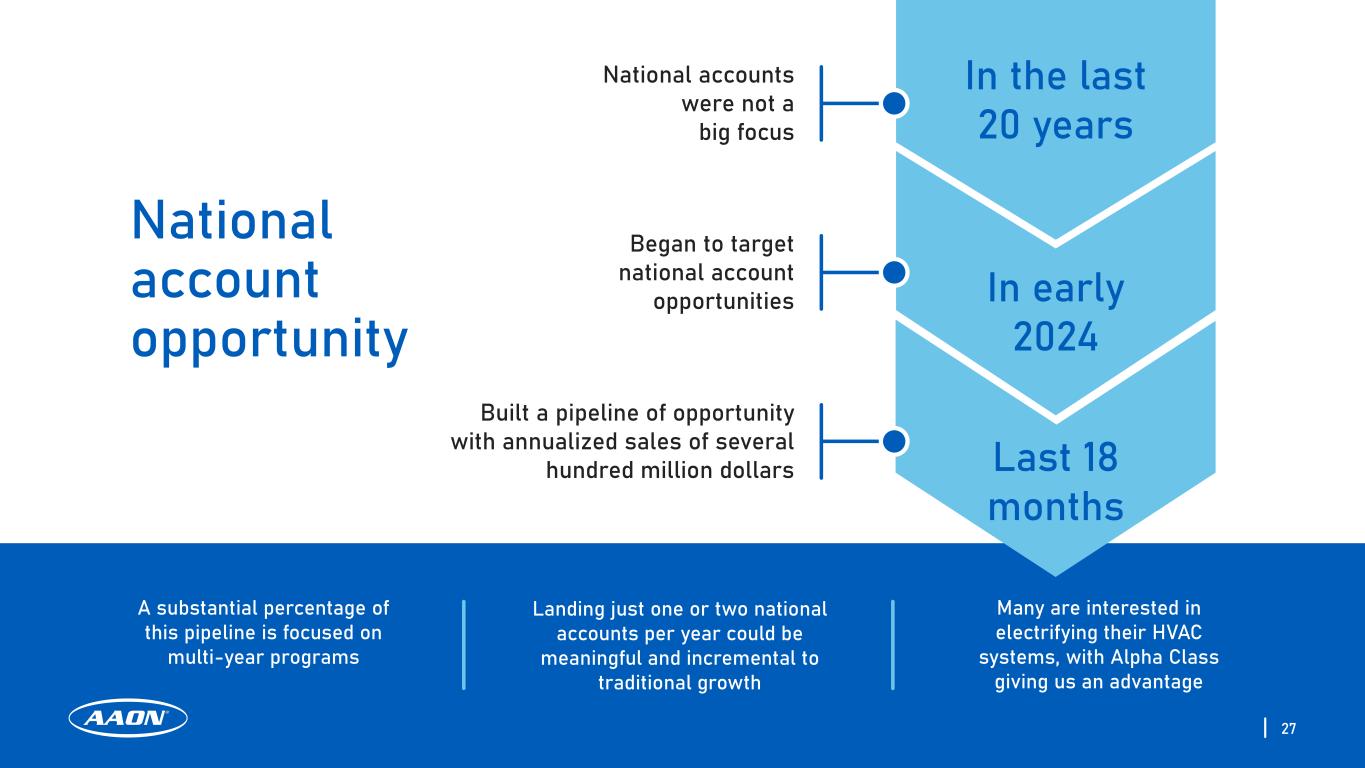 2023 AAON’s Alpha Class were the only heat pumps operable below 30OF, and were operable all the way down to 0OF 2025 Introducing Alpha Class with operability down to -20OF, meeting the Department of Energy’s challenge two years ahead of requirement 2024 AAON's total rooftop sales were down 5% The Alpha Class category was up 39% Continuing to innovate with Alpha Class and heat pumps ¹ All data is based on 2024. Alpha Class is a product category of the AAON brand that includes commercial HVAC equipment fueled by a fully electric heat pumps There is a large pipeline of customers interested in decarbonizing and electrifying their HVAC systems ~15% of rooftop sales¹ 10% of total company sales¹ 26