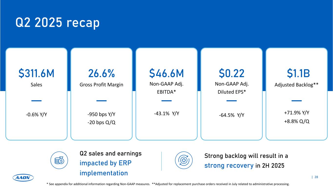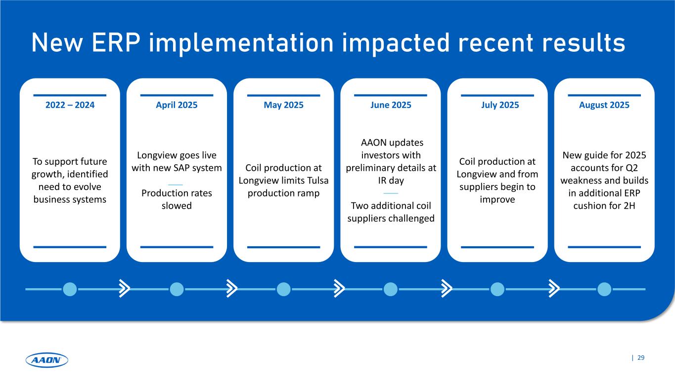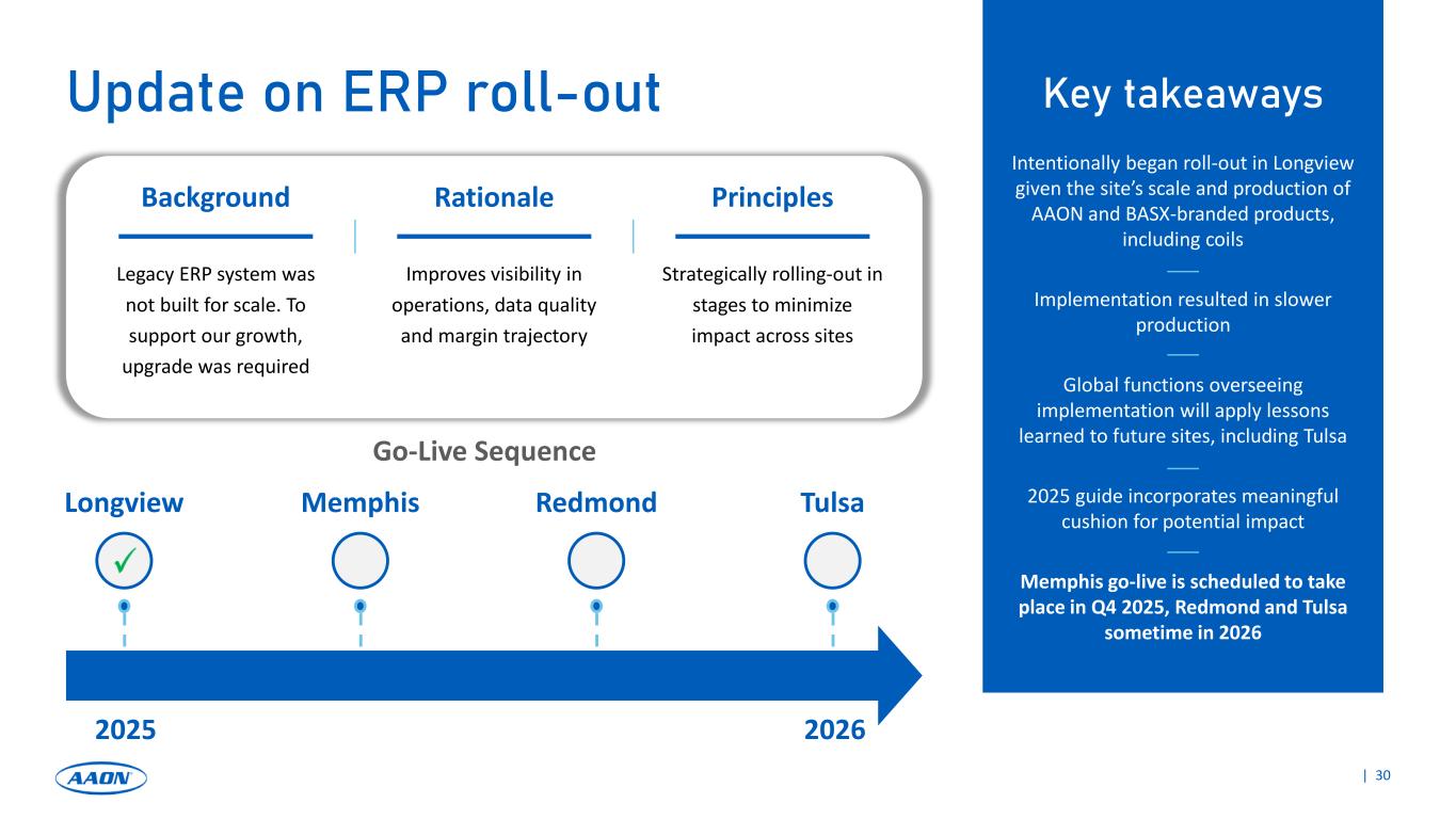 | 29 New ERP implementation impacted recent results To support future growth, identified need to evolve business systems Longview goes live with new SAP system Production rates slowed Coil production at Longview limits Tulsa production ramp AAON updates investors with preliminary details at IR day Two additional coil suppliers challenged Coil production at Longview and from suppliers begin to improve New guide for 2025 accounts for Q2 weakness and builds in additional ERP cushion for 2H 2022 – 2024 April 2025 May 2025 June 2025 July 2025 August 2025