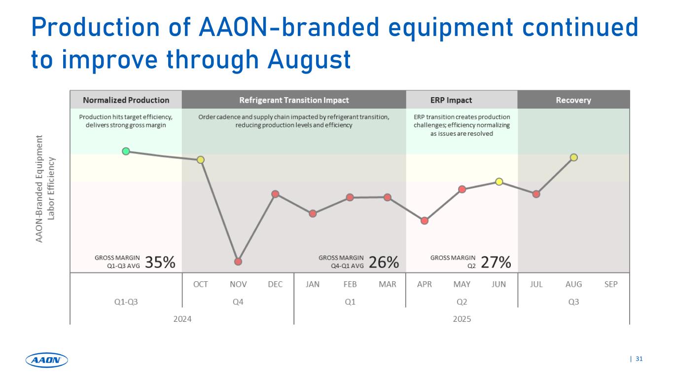 | 30 Update on ERP roll-out Key takeaways Intentionally began roll-out in Longview given the site’s scale and production of AAON and BASX-branded products, including coils Implementation resulted in slower production Global functions overseeing implementation will apply lessons learned to future sites, including Tulsa 2025 guide incorporates meaningful cushion for potential impact Memphis go-live is scheduled to take place in Q4 2025, Redmond and Tulsa sometime in 2026 Go-Live Sequence Longview Memphis Redmond Tulsa Legacy ERP system was not built for scale. To support our growth, upgrade was required Background Improves visibility in operations, data quality and margin trajectory Rationale Strategically rolling-out in stages to minimize impact across sites Principles 2025 2026