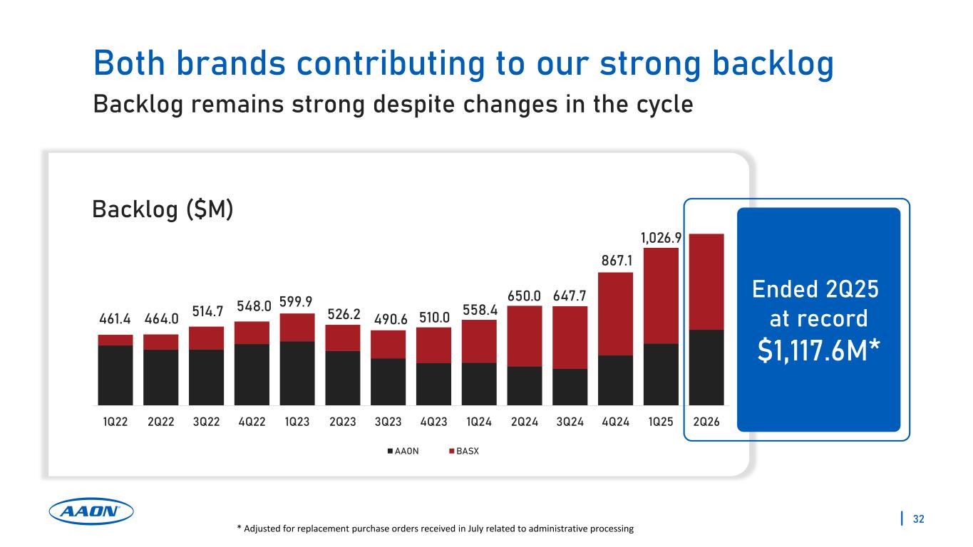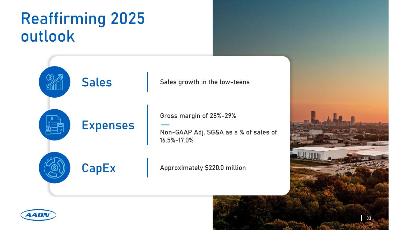1Q22 2Q22 3Q22 4Q22 1Q23 2Q23 3Q23 4Q23 1Q24 2Q24 3Q24 4Q24 1Q25 2Q26 AAON BASX Both brands contributing to our strong backlog Backlog remains strong despite changes in the cycle Ended 2Q25 at record �1,117.6M* 461.4 464.0 514.7 548.0 599.9 526.2 490.6 510.0 558.4 650.0 647.7 867.1 Backlog (�M) 1,026.9 * Adjusted for replacement purchase orders received in July related to administrative processing 32