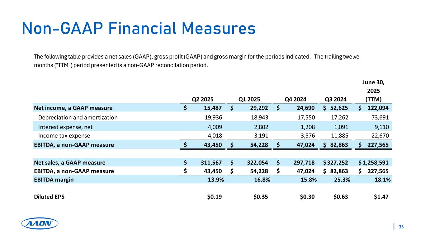 Non-GAAP Financial Measures 36 The following table provides a net sales (GAAP), gross profit (GAAP) and gross margin for the periods indicated. The trailing twelve months ("TTM") period presented is a non-GAAP reconcilation period. June 30, 2025 Q2 2025 Q1 2025 Q4 2024 Q3 2024 (TTM) Net income, a GAAP measure 15,487$ 29,292$ 24,690$ 52,625$ 122,094$ Depreciation and amortization 19,936 18,943 17,550 17,262 73,691 Interest expense, net 4,009 2,802 1,208 1,091 9,110 Income tax expense 4,018 3,191 3,576 11,885 22,670 EBITDA, a non-GAAP measure 43,450$ 54,228$ 47,024$ 82,863$ 227,565$ Net sales, a GAAP measure 311,567$ 322,054$ 297,718$ 327,252$ 1,258,591$ EBITDA, a non-GAAP measure 43,450$ 54,228$ 47,024$ 82,863$ 227,565$ EBITDA margin 13.9% 16.8% 15.8% 25.3% 18.1% Diluted EPS $0.19 $0.35 $0.30 $0.63 $1.47