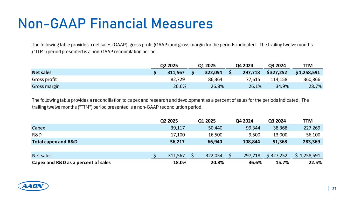 Non-GAAP Financial Measures The following table provides a net sales (GAAP), gross profit (GAAP) and gross margin for the periods indicated. The trailing twelve months ("TTM") period presented is a non-GAAP reconcilation period. Q2 2025 Q1 2025 Q4 2024 Q3 2024 TTM Net sales 311,567$ 322,054$ 297,718$ 327,252$ 1,258,591$ Gross profit 82,729 86,364 77,615 114,158 360,866 Gross margin 26.6% 26.8% 26.1% 34.9% 28.7% The following table provides a reconciliation to capex and research and devolopment as a percent of sales for the periods indicated. The trailing twelve months ("TTM") period presented is a non-GAAP reconcilation period. Q2 2025 Q1 2025 Q4 2024 Q3 2024 TTM Capex 39,117 50,440 99,344 38,368 227,269 R&D 17,100 16,500 9,500 13,000 56,100 Total capex and R&D 56,217 66,940 108,844 51,368 283,369 Net sales 311,567$ 322,054$ 297,718$ 327,252$ 1,258,591$ Capex and R&D as a percent of sales 18.0% 20.8% 36.6% 15.7% 22.5% 37