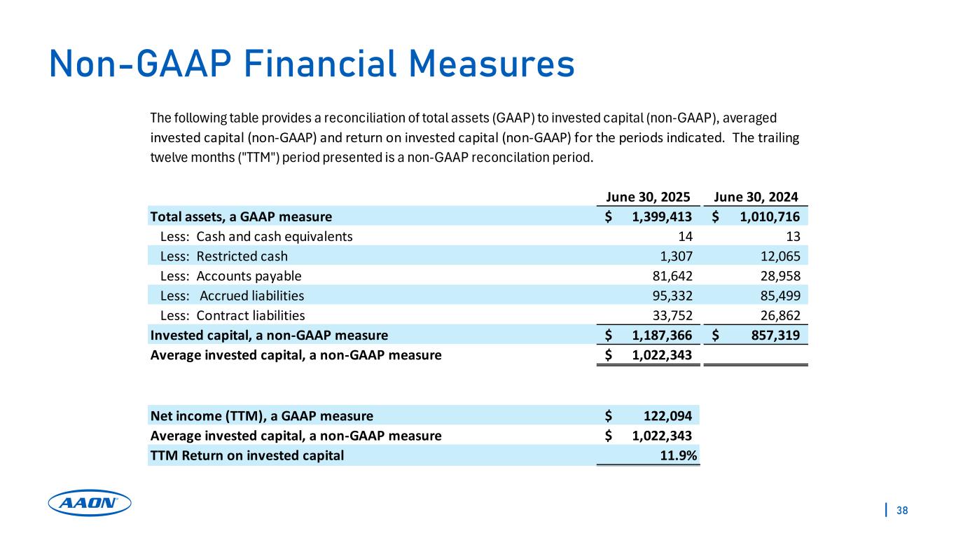 Non-GAAP Financial Measures 38 The following table provides a reconciliation of total assets (GAAP) to invested capital (non-GAAP), averaged invested capital (non-GAAP) and return on invested capital (non-GAAP) for the periods indicated. The trailing twelve months ("TTM") period presented is a non-GAAP reconcilation period. June 30, 2025 June 30, 2024 Total assets, a GAAP measure 1,399,413$ 1,010,716$ Less: Cash and cash equivalents 14 13 Less: Restricted cash 1,307 12,065 Less: Accounts payable 81,642 28,958 Less: Accrued liabilities 95,332 85,499 Less: Contract liabilities 33,752 26,862 Invested capital, a non-GAAP measure 1,187,366$ 857,319$ Average invested capital, a non-GAAP measure 1,022,343$ Net income (TTM), a GAAP measure 122,094$ Average invested capital, a non-GAAP measure 1,022,343$ TTM Return on invested capital 11.9%