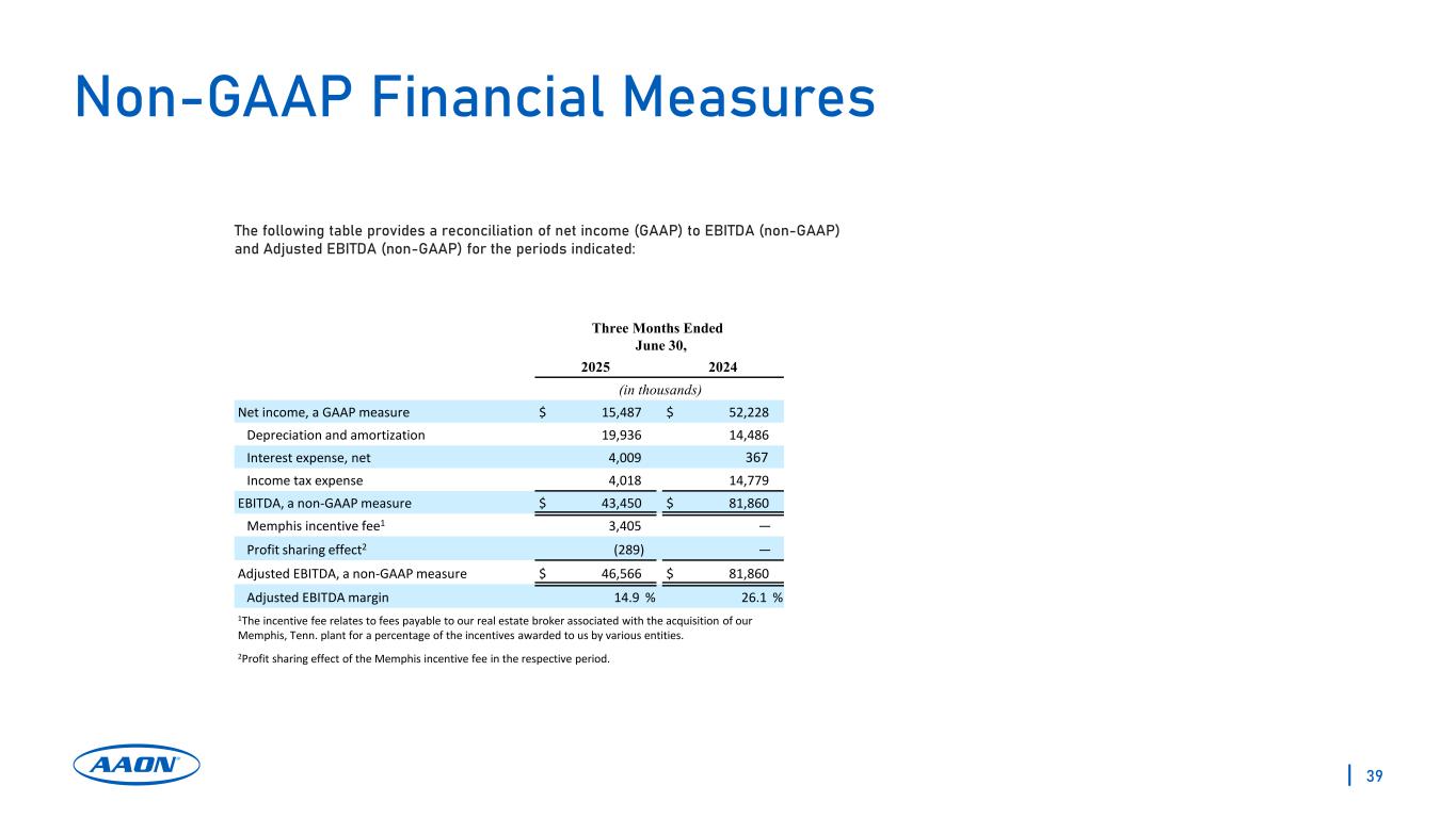 Non-GAAP Financial Measures Three Months Ended June 30, 2025 2024 (in thousands) Net income, a GAAP measure $ 15,487 $ 52,228 Depreciation and amortization 19,936 14,486 Interest expense, net 4,009 367 Income tax expense 4,018 14,779 EBITDA, a non-GAAP measure $ 43,450 $ 81,860 Memphis incentive fee1 3,405 — Profit sharing effect2 (289) — Adjusted EBITDA, a non-GAAP measure $ 46,566 $ 81,860 Adjusted EBITDA margin 14.9 % 26.1 % 1The incentive fee relates to fees payable to our real estate broker associated with the acquisition of our Memphis, Tenn. plant for a percentage of the incentives awarded to us by various entities. 2Profit sharing effect of the Memphis incentive fee in the respective period. The following table provides a reconciliation of net income (GAAP) to EBITDA (non-GAAP) and Adjusted EBITDA (non-GAAP) for the periods indicated: 39