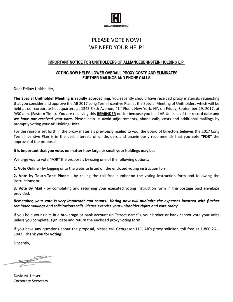 9:30 a.m. (Eastern Time). You are receiving this REMINDER notice because you held AB Units as of the record date and