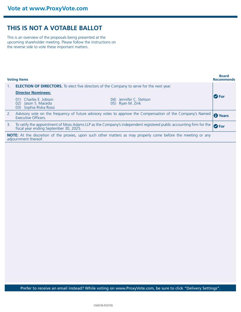 Vote at www.ProxyVote.comPrefer to receive an email instead? While voting on www.ProxyVote.com, be sure to click "Delivery Settings".V59078-P20705Voting ItemsBoard RecommendsTHIS IS NOT A VOTABLE BALLOTThis is an overview of the proposals being presented at the upcoming shareholder meeting. Please follow the instructions on the reverse side to vote these important matters.1. ELECTION OF DIRECTORS. To elect five directors of the Company to serve for the next year.For Director Nominees:01) Charles E. Jobson02) Jason S. Maceda03) Sophia Rivka Rossi04) Jennifer C. Stetson 05) Ryan M. Zink2. Advisory vote on the frequency of future advisory votes to approve the Compensation of the Company's Named Executive Officers.2Years3. To ratify the appointment of Moss Adams LLP as the Company's independent registered public accounting firm for the fiscal year ending September 30, 2025.ForNOTE: At the discretion of the proxies, upon such other matters as may properly come before the meeting or any adjournment thereof.