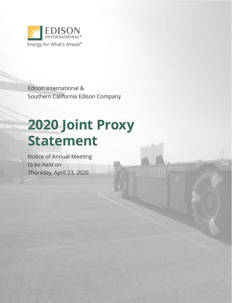 On behalf of the Board of Directors, we are pleased to invite you to attend the Edison International and Southern California Edison Company Annual Meeting of Shareholders. The Annual Meeting will be held on Thursday, April 23, 2020, at 9:00 a.m., Pacific Time, at the SCE Energy Education Center, 6090 N. Irwindale Avenue, Irwindale, California 91702. Please note this is a new location for the 2020 Annual Meeting. The Proxy Statement contains important information about the business to be conducted at the Annual Meeting and the Board’s role in our corporate governance and executive compensation. We encourage you to read the Proxy Statement and vote your shares promptly, whether or not you plan to attend the Annual Meeting.