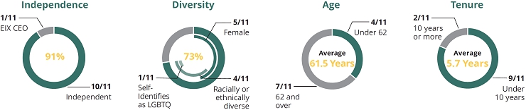Edison International (“EIX”) remains deeply committed to our vision to transform the electric power industry toward a clean energy future, making progress to address the impacts of climate change, advance economy-wide electrification and deliver long-term value to all stakeholders. Our commitment to diversity, equity and inclusion (“DEI”) – with one of the most diverse boards and management teams in our industry and across the economy – underpins our success. The Proxy Statement describes the Board’s oversight of sustainability, DEI and other ESG issues, which are core to our strategy.