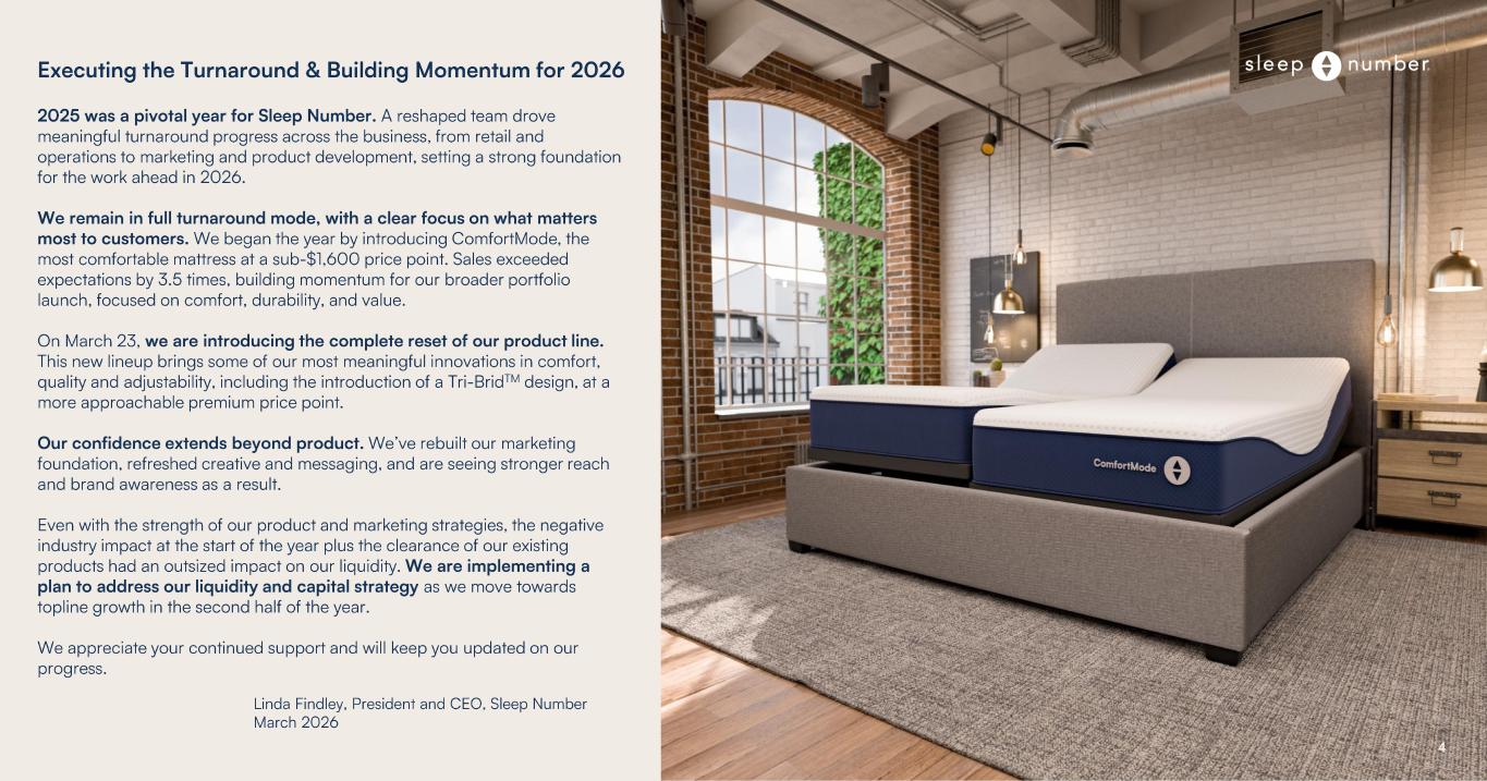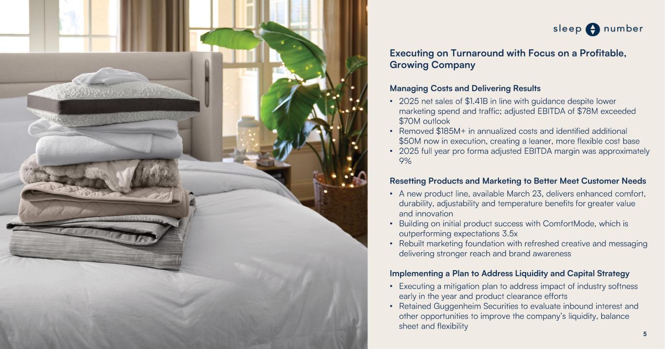 Executing the Turnaround & Building Momentum for 2026 2025 was a pivotal year for Sleep Number. A reshaped team drove meaningful turnaround progress across the business, from retail and operations to marketing and product development, setting a strong foundation for the work ahead in 2026. We remain in full turnaround mode, with a clear focus on what matters most to customers. We began the year by introducing ComfortMode , the most comfortable mattress at a sub -$1,600 price point. Sales exceeded expectations by 3.5 times, building momentum for our broader portfolio launch, focused on comfort, durability, and value. On March 23, we are introducing the complete reset of our product line. This new lineup brings some of our most meaningful innovations in comfort, quality and adjustability, including the introduction of a Tri -Brid TM design, at a more approachable premium price point. Our confidence extends beyond product. We’ve rebuilt our marketing foundation, refreshed creative and messaging, and are seeing stronger reach and brand awareness as a result. Even with the strength of our product and marketing strategies, the negative industry impact at the start of the year plus the clearance of our existing products had an outsized impact on our liquidity. We are implementing a plan to address our liquidity and capital strategy as we move towards topline growth in the second half of the year. We appreciate your continued support and will keep you updated on our progress. Linda Findley, President and CEO, Sleep Number March 2026 4