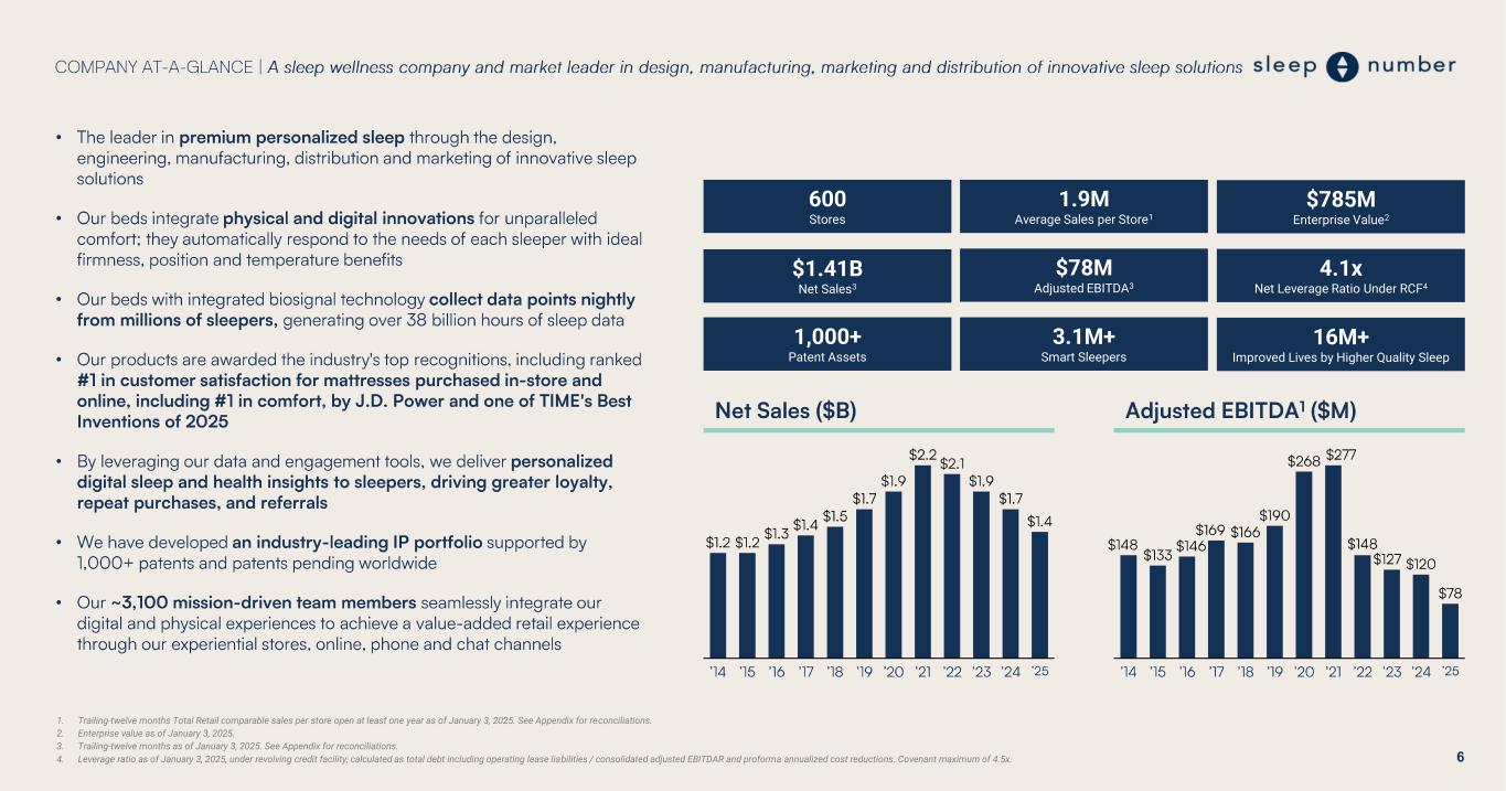 This investor presentation contains statements regarding the company’s expectations, future plans, events, financial results or performance, such as: the company has a clear focus on the consumer through a simple turnaround strategy – Sleep Number Shifts: product – simplifying the offering with a focus on consumer benefits, marketing – modernization of tactics and focus on funnel optimization and ROI, and distribution – opportunity to expand distribution into both physical and digital channels; the company expects improvements in financial results, driven by the turnaround stra tegy; the company is positioned to restructure the balance sheet with longer - duration debt to drive long - term shareholder value creation; it is aggressively dri ving the turnaround plan focused on the consumer, including: modernized marketing to drive efficiency, revised loan covenants and maturity extension c reate space to invest in marketing and product, and launching a simpler and differentiated product offering that it expects will improve shop - ability, co nversion, margins, and efficiency, building on pilots and pursuing additional distribution opportunities; the company is implementing a plan to addr ess its liquidity and capital strategy as it moves toward topline growth in the second half of the year; the company’s plans to elevate core differentiation, streng then value proposition, and improve operational efficiency and margins; a tighter net product margin range across the portfolio enables sales team to mat ch customer to ideal products; the company’s amended credit agreement and a lower cost structure is expected to bring financial stability in 2026; the compa ny plans to execute approximately $50 million of annualized cost actions in 2026; the company expects that cost headwinds for standard inflationa ry items and variable compensation may return to targeted levels if 2026 plan is achieved; the company’s strong brand awareness and a highly differ entiated product are supported by a transformed business model, amplifying the company’s earning potential; and the company expects that a stabili zed top line and consistent gross margins and reductions to the fixed cost structure will drive a return to free cash flow generation in 2026, are forwar d- looking statements subject to certain risks and uncertainties which could cause the company’s results to differ materially. The most important risks and un cer tainties are described in the company’s filings with the Securities and Exchange Commission, including in Item 1A of the company’s Annual Report on Form 10 - K and other periodic reports. Forward - looking statements speak only as of the date they are made, and the company does not undertake any obligation t o update any forward - looking statement. USE OF NON -GAAP FINANCIAL MEASURES INFORMATION The company defines earnings before interest, taxes, depreciation and amortization (adjusted EBITDA) as net income (loss) plu s: income tax expense (benefit), interest expense, depreciation and amortization, stock - based compensation, restructuring costs, other non - recurring items, and a sset impairments. Management believes adjusted EBITDA is a useful indicator of the company’s financial performance and its ability to generate cas h from operating activities. The company's definition of adjusted EBITDA may not be comparable to similarly titled definitions used by other companies. FORWARD LOOKING STATEMENTS 2