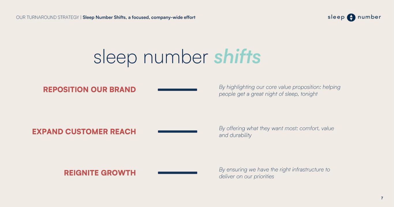1. Trailing-twelve months Total Retail comparable sales per store open at least one year as of January 3, 2025. See Appendix for reconciliations. 2. Enterprise value as of January 3, 2025. 3. Trailing-twelve months as of January 3, 2025. See Appendix for reconciliations. 4. Leverage ratio as of January 3, 2025, under revolving credit facility; calculated as total debt including operating lease liabilities / consolidated adjusted EBITDAR and proforma annualized cost reductions. Covenant maximum of 4.5x. COMPANY AT -A-GLANCE | A sleep wellness company and market leader in design, manufacturing, marketing and distribution of innovative sleep solutions • The leader in premium personalized sleep through the design, engineering, manufacturing, distribution and marketing of innovative sleep solutions • Our beds integrate physical and digital innovations for unparalleled comfort; they automatically respond to the needs of each sleeper with ideal firmness, position and temperature benefits • Our beds with integrated biosignal technology collect data points nightly from millions of sleepers, generating over 38 billion hours of sleep data • Our products are awarded the industry's top recognitions, including ranked #1 in customer satisfaction for mattresses purchased in - store and online, including #1 in comfort, by J.D. Power and one of TIME's Best Inventions of 2025 • By leveraging our data and engagement tools, we deliver personalized digital sleep and health insights to sleepers, driving greater loyalty, repeat purchases, and referrals • We have developed an industry - leading IP portfolio supported by 1,000+ patents and patents pending worldwide • Our ~3,100 mission - driven team members seamlessly integrate our digital and physical experiences to achieve a value -added retail experience through our experiential stores, online, phone and chat channels 6 $1.2 $1.2 $1.3 $1.4 $1.5 $1.7 $1.9 $2.2 $2.1 $1.9 $1.7 $1.4 ’14 ’15 ’16 ’17 ’18 ’19 ’20 ’21 ’22 ’23 ’24 ’25 600 Stores $1.41B Net Sales3 1,000+ Patent Assets 1.9M Average Sales per Store1 $78M Adjusted EBITDA3 3.1M+ Smart Sleepers $785M Enterprise Value2 4.1x Net Leverage Ratio Under RCF4 16M+ Improved Lives by Higher Quality Sleep Net Sales ($B) $148 $133 $146 $169 $166 $190 $268 $277 $148 $127 $120 $78 ’14 ’15 ’16 ’17 ’18 ’19 ’20 ’21 ’22 ’23 ’24 ’25 Adjusted EBITDA 1 ($M)