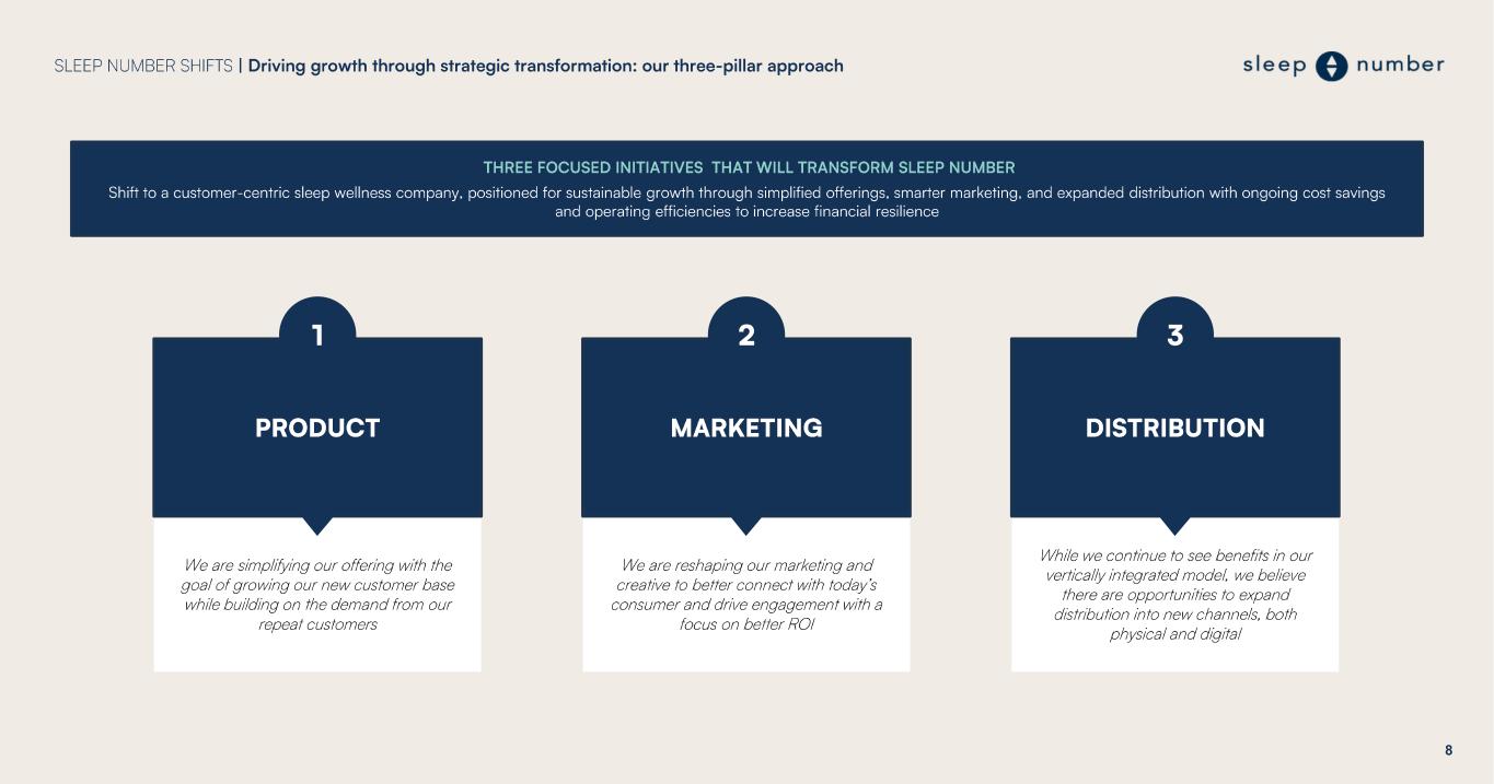 7 sleep number shifts OUR TURNAROUND STRATEGY | Sleep Number Shifts, a focused, company - wide effort REPOSITION OUR BRAND By highlighting our core value proposition: helping people get a great night of sleep, tonight EXPAND CUSTOMER REACH By offering what they want most: comfort, value and durability REIGNITE GROWTH By ensuring we have the right infrastructure to deliver on our priorities