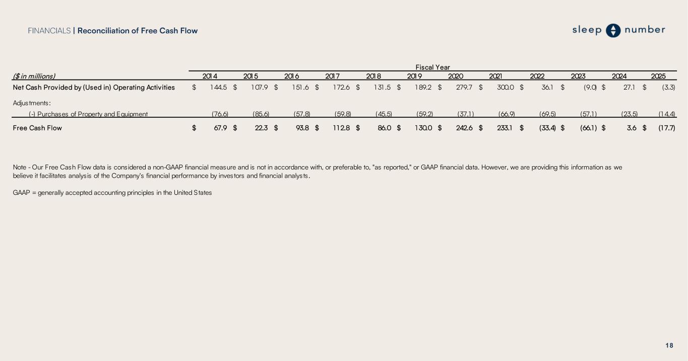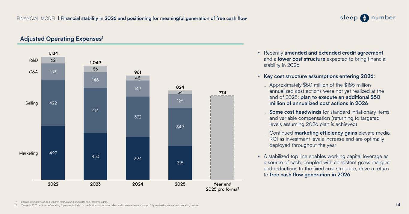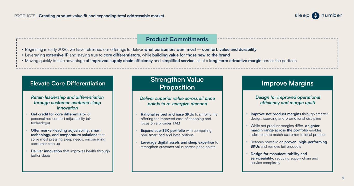 Why Now, Why Sleep Number Our leaner cost structure and gross margin profile is expected to create stabilization, regardless of industry trends Unique Position Advantage • Strong and recognizable brand • Unique and innovative product Clear Value Creation Pathway • New leadership team driving the business turnaround • Clear focus on the consumer: product, marketing, and distribution Shareholder Value Creation • Gross margin profile, reduced fixed cost structure, and negative working capital leads to strong cash flow generation with growth • New marketing efficiencies will produce return on growth at stable spend • Free cash flow used to reduce balance sheet leverage Expected Returns and Timeline • Modernization of marketing is underway, supported by stabilized investments in demand generation • Simpler and differentiated product offering launched in 2026, supported by expanded distribution