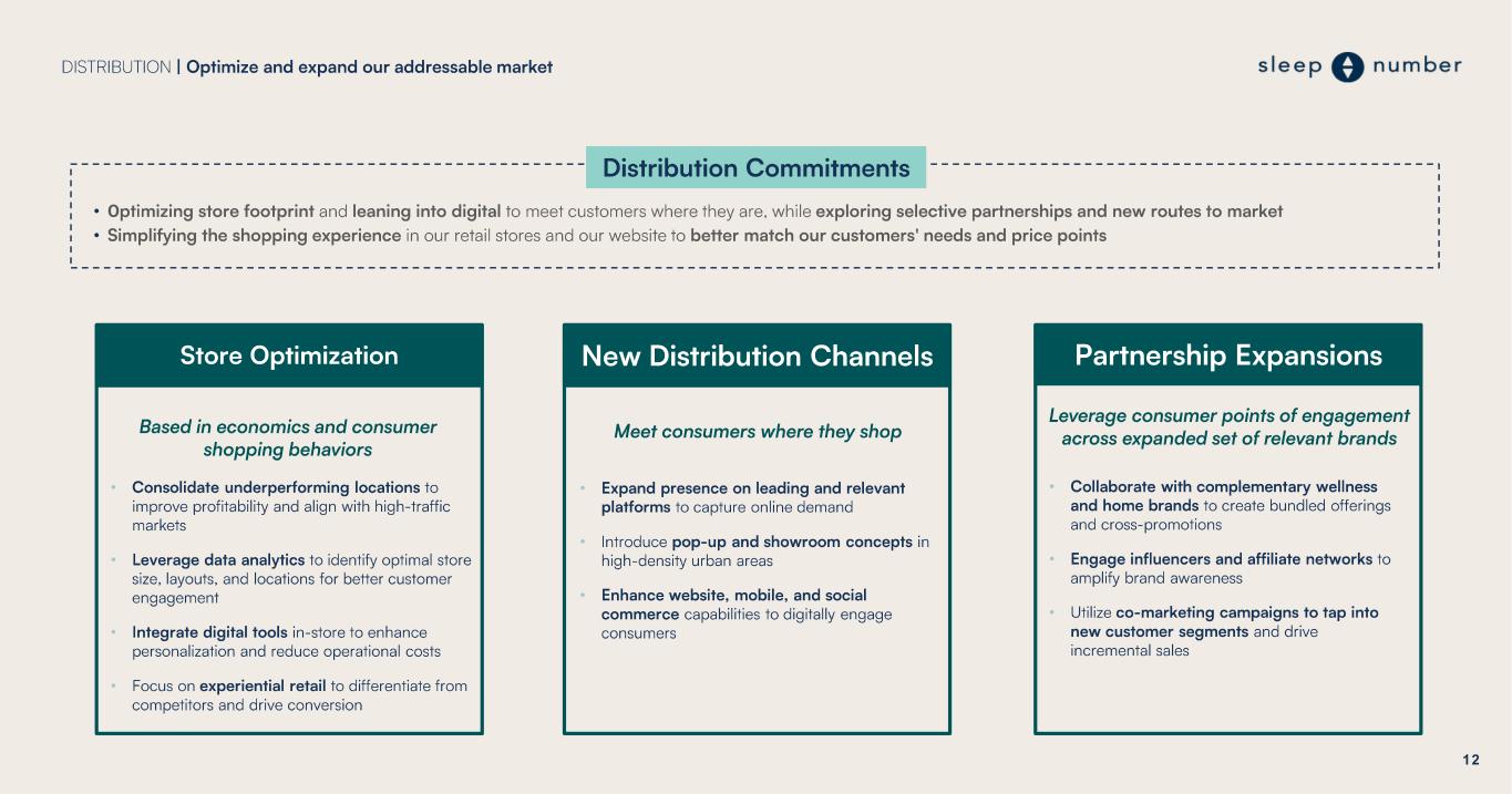DISTRIBUTION | Optimize and expand our addressable market 12 • Optimizing store footprint and leaning into digital to meet customers where they are, while exploring selective partnerships and new routes to market • Simplifying the shopping experience in our retail stores and our website to better match our customers' needs and price points Distribution Commitments New Distribution Channels • Expand presence on leading and relevant platforms to capture online demand • Introduce pop - up and showroom concepts in high - density urban areas • Enhance website, mobile, and social commerce capabilities to digitally engage consumers Meet consumers where they shop Partnership Expansions • Collaborate with complementary wellness and home brands to create bundled offerings and cross - promotions • Engage influencers and affiliate networks to amplify brand awareness • Utilize co - marketing campaigns to tap into new customer segments and drive incremental sales Leverage consumer points of engagement across expanded set of relevant brands Store Optimization Based in economics and consumer shopping behaviors • Consolidate underperforming locations to improve profitability and align with high - traffic markets • Leverage data analytics to identify optimal store size, layouts, and locations for better customer engagement • Integrate digital tools in- store to enhance personalization and reduce operational costs • Focus on experiential retail to differentiate from competitors and drive conversion