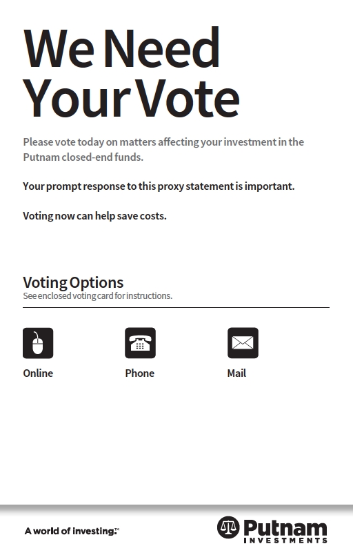 We are asking for your vote on important matters affecting your investment in one or more of the Putnam closed-end funds. The Putnam closed-end funds will hold their annual shareholder meetings on April 26, 2024 in Boston, Massachusetts. We are asking you — and all shareholders — to consider and vote on the important matters described below.