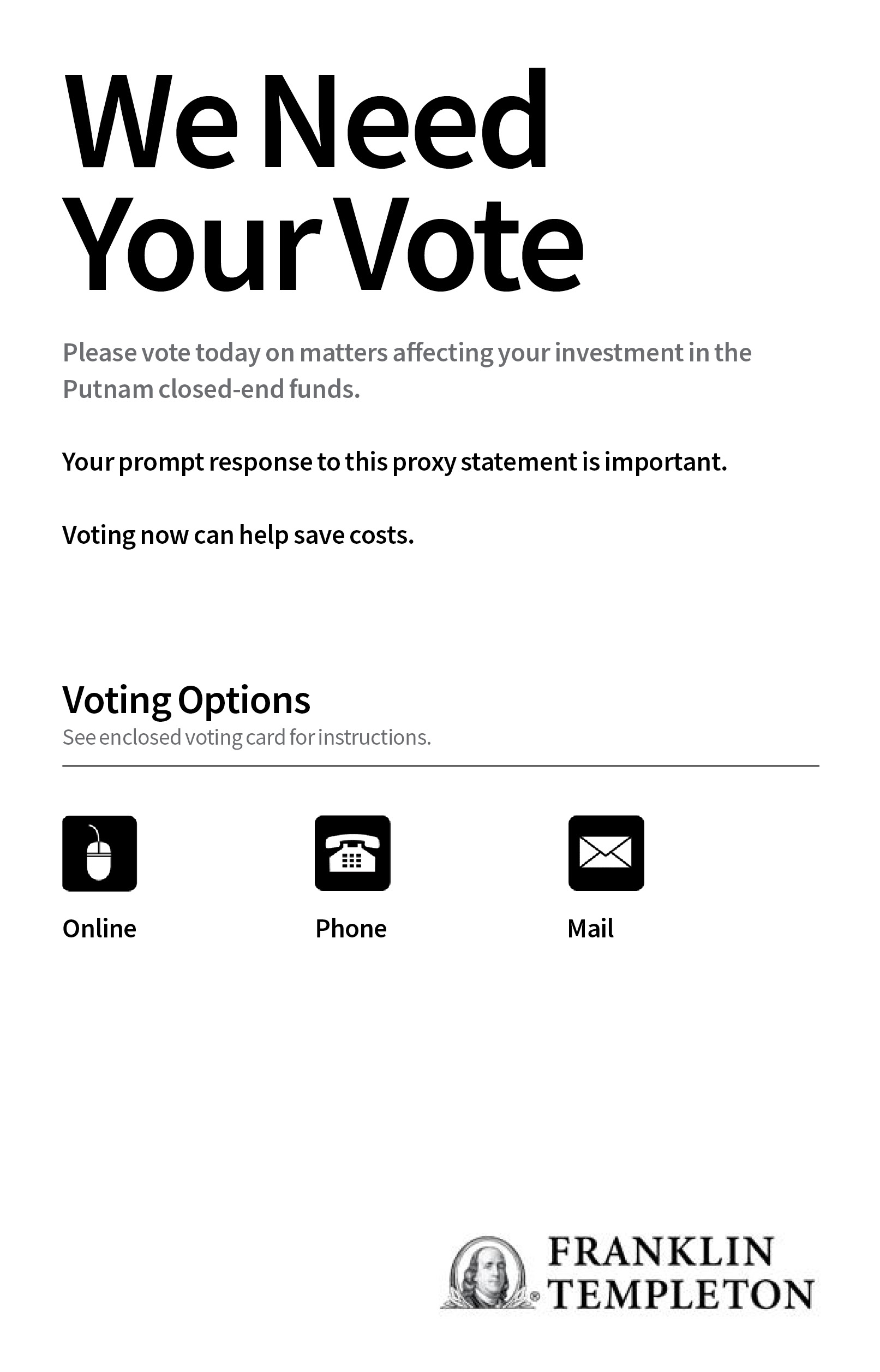 We are asking for your vote on important matters affecting your investment in one or more of the Putnam closed-end funds. The Putnam closed-end funds will hold their annual shareholder meetings on April 25, 2025, in Boston, Massachusetts. We are asking you — and all shareholders — to consider and vote on the important matters described below.