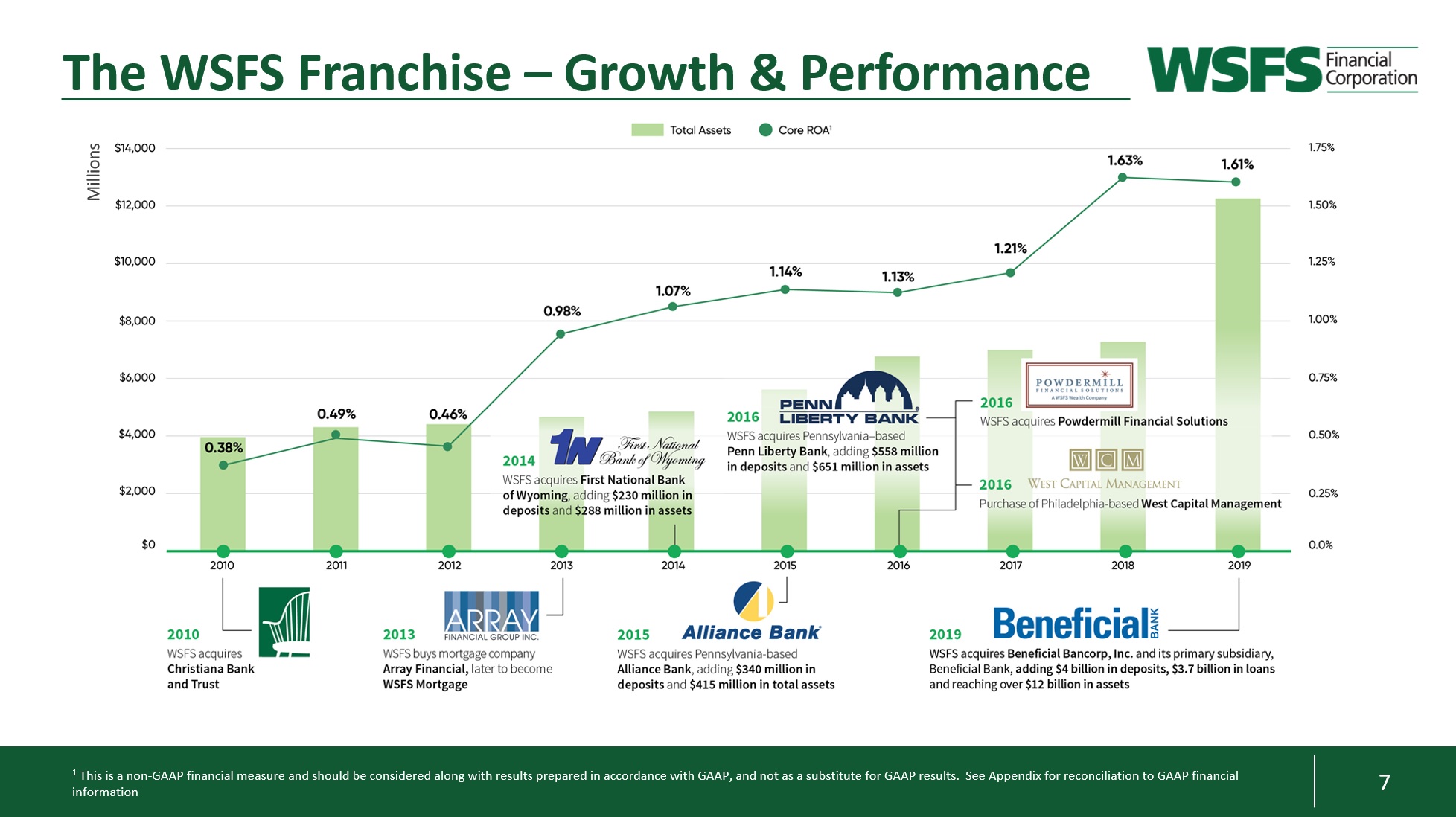 6 Education & Health Services 23% Trade, Transportation, & Utilities 18% Professional & Business Services 16% Government 12% Financial Activities 8% Leisure & Hospitality 7% Manufacturing 6% Other 10% Employment – Industry Breakdown ~10 - 20% higher income than the U.S. overall 1 Bureau of Labor Statistics, as of September 2020: Employees on nonfarm payrolls by industry supersector ; Philadelphia - Camden - Wilmington MSA; not seasonally adjusted 2 Unemployment rate for the Philadelphia - Camden - Wilmington MSA, as of September 2020. Preliminary, not seasonally adjusted 3 U.S. Census Bureau: 2019 American Community Survey; Philadelphia - Camden - Wilmington MSA 4 Bureau of Labor Statistics, as of May 2019 : Occupational Employment and Wages, Philadelphia - Camden - Wilmington, MSA Diversity of industries drives stable and favorable employment and economic growth in our markets Regional Employment Composition 1 Regional Statistics 3 The WSFS Franchise - Our Markets Philadelphia - Camden - Wilmington MSA Over 4% of U.S. within branch network 6.1M Population 2.3M Households 2.5M Housing Units $40.9K Per Capita Income $264K Median Home Value ~10% higher household value than the U.S. overall 38.9 Median Age 67% Housing Owner Occupied 7.9% Unemployment 2 • Consistent with overall U.S. • 45% improvement since 2Q 2020 peak Purchasing power vs. US Avg Income $27.69 Mean Hourly Wage 4 $74.5K Median Home Income