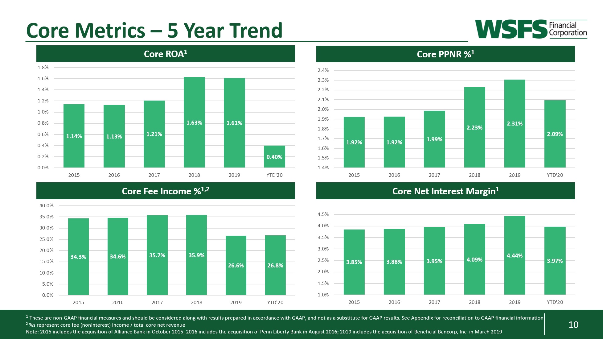9 1 These are non - GAAP financial measures and should be considered along with results prepared in accordance with GAAP, and not as a substitute for GAAP results. See Appendix for reconciliation to GAAP financial information. 2 Tax - equivalent YTD – September 2020 Financial Highlights • Core PPNR 1 of $203.0 million increased $4.8 million , or 2%, from YTD September 2019 • Core fee income 1 increased $5.6 million , or 5%, compared to YTD September 2019, despite a $3.2 million negative impact due to Durbin Amendment (effective July 2020) • Provision expense increased $130.1 million compared to YTD September 2019 due to the significant deterioration in the economic forecast used in our CECL models and loan migration in certain loan portfolios related to the impact of COVID - 19 • The ACL coverage ratio excluding PPP loans was 2.74% as of September 30, 2020 compared to 0.56% as of September 30, 2019 • The WSFS Bank common equity Tier 1 capital ratio was 13.24% as of September 30, 2020 compared to 13.01% as of September 30, 2019 YTD – September 2020 $ in millions (expect per share amounts) Reported Core EPS $1.08 $0.77 1 Net Income attributable to WSFS $55.0 $39.0 1 PPNR 1 $221.9 $203.0 PPNR % 1 2.29% 2.09% ROA 0.57% 0.40% 1 ROE 3.99% 2.84% 1 ROTCE 1 6.44% 4.76% NIM 3.97% 3.97% Fee Income $154.4 $125.7 1 Fee Income % 2 31.0% 26.8% 1 Efficiency Ratio 55.3% 56.6% 1 ACL Ratio ex PPP 2.74% 2.74% Loan - to - Deposit % 83% 83% CET - 1 Capital 13.24% 13.24%