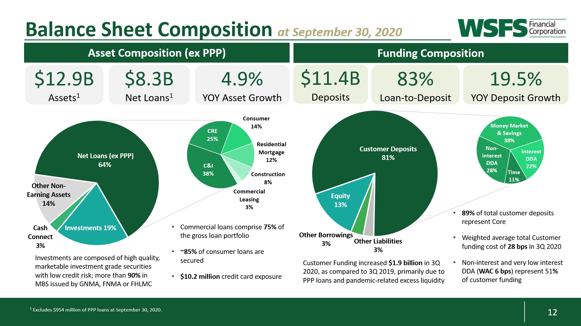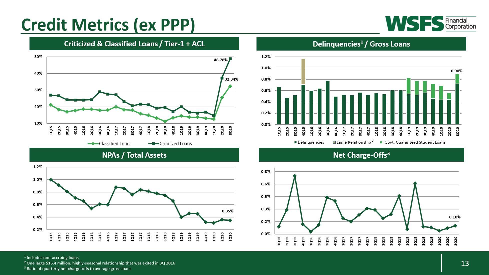 12 Time 11% Non - interest DDA 28% Money Market & Savings 38% Interest DDA 22% Customer Funding increased $1.9 billion in 3Q 2020, as compared to 3Q 2019, primarily due to PPP loans and pandemic - related excess liquidity Balance Sheet Composition at September 30, 2020 C&I 38% CRE 25% Consumer 14% Residential Mortgage 12% Construction 8% Commercial Leasing 3% Investments 19% Cash Connect 3% Other Non - Earning Assets 14% Net Loans (ex PPP) 64% • Commercial loans comprise 75% of the gross loan portfolio • ~85% of consumer loans are secured • $10.2 million credit card exposure Equity 13% Customer Deposits 81% • 89% of total customer deposits represent Core • Weighted average total Customer funding cost of 28 bps in 3Q 2020 • Non - interest and very low interest DDA ( WAC 6 bps ) represent 51 % of customer funding Investments are composed of high quality, marketable investment grade securities with low credit risk; more than 90% in MBS issued by GNMA, FNMA or FHLMC 1 Excludes $954 million of PPP loans at September 30, 2020. $12.9B Assets 1 $8.3B Net Loans 1 Asset Composition (ex PPP) 4.9% YOY Asset Growth Funding Composition $11.4B Deposits 83% Loan - to - Deposit 19.5% YOY Deposit Growth Other Borrowings 3% Other Liabilities 3%