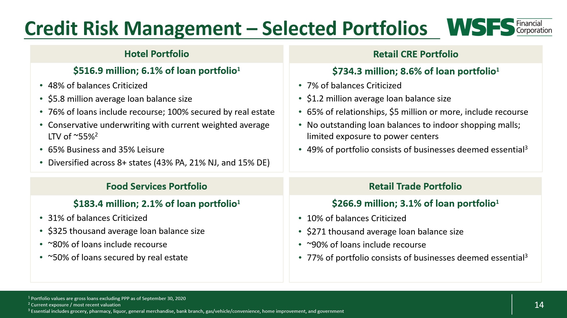 13 0.0% 0.2% 0.3% 0.5% 0.6% 0.8% 1Q15 2Q15 3Q15 4Q15 1Q16 2Q16 3Q16 4Q16 1Q17 2Q17 3Q17 4Q17 1Q18 2Q18 3Q18 4Q18 1Q19 2Q19 3Q19 4Q19 1Q20 2Q20 3Q20 0.2% 0.4% 0.6% 0.8% 1.0% 1.2% 1Q15 2Q15 3Q15 4Q15 1Q16 2Q16 3Q16 4Q16 1Q17 2Q17 3Q17 4Q17 1Q18 2Q18 3Q18 4Q18 1Q19 2Q19 3Q19 4Q19 1Q20 2Q20 3Q20 10% 20% 30% 40% 50% 1Q15 2Q15 3Q15 4Q15 1Q16 2Q16 3Q16 4Q16 1Q17 2Q17 3Q17 4Q17 1Q18 2Q18 3Q18 4Q18 1Q19 2Q19 3Q19 4Q19 1Q20 2Q20 3Q20 Classified Loans Criticized Loans Delinquencies 1 / Gross Loans Net Charge - Offs 3 1 Includes non - accruing loans 2 One large $15.4 million, highly - seasonal relationship that was exited in 3Q 2016 3 Ratio of quarterly net charge - offs to average gross loans Criticized & Classified Loans / Tier - 1 + ACL NPAs / Total Assets 48.78% 32.34% 0.35% 0.10% Credit Metrics (ex PPP) 0.0% 0.2% 0.4% 0.6% 0.8% 1.0% 1.2% 1Q15 2Q15 3Q15 4Q15 1Q16 2Q16 3Q16 4Q16 1Q17 2Q17 3Q17 4Q17 1Q18 2Q18 3Q18 4Q18 1Q19 2Q19 3Q19 4Q19 1Q20 2Q20 3Q20 Delinquencies Large Relationship Govt. Guaranteed Student Loans 0.90% 2