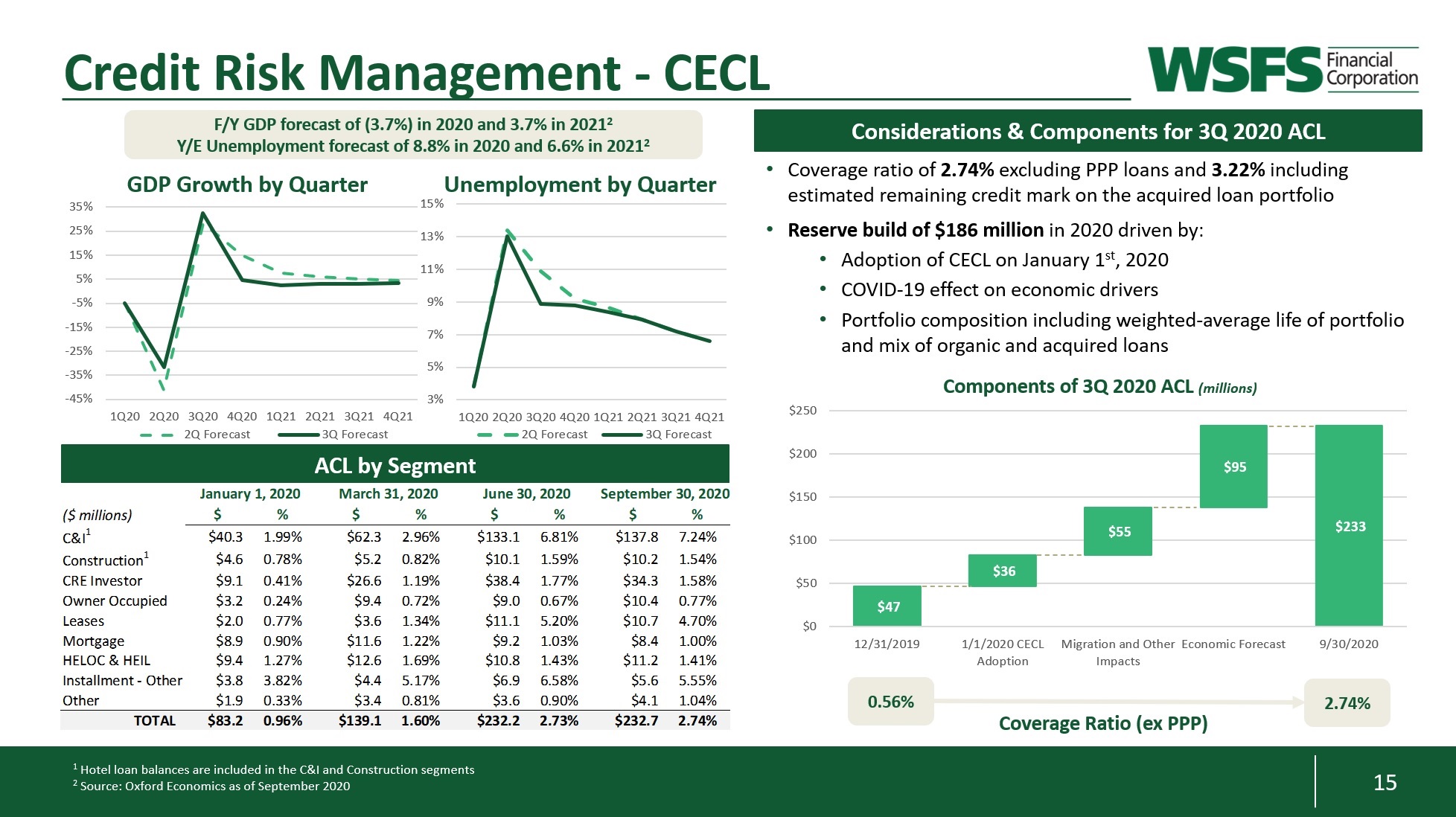 14 3 Credit Risk Management – Selected Portfolios Hotel Portfolio Retail Trade Portfolio Retail CRE Portfolio Food Services Portfolio 1 Portfolio values are gross loans excluding PPP as of September 30, 2020 2 Current exposure / most recent valuation 3 Essential includes grocery, pharmacy, liquor, general merchandise, bank branch, gas/vehicle/convenience, home improvement, an d government $266.9 million; 3.1% of loan portfolio 1 • 10% of balances Criticized • $271 thousand average loan balance size • ~90% of loans include recourse • 77% of portfolio consists of businesses deemed essential 3 $183.4 million; 2.1% of loan portfolio 1 • 31% of balances Criticized • $325 thousand average loan balance size • ~80% of loans include recourse • ~50% of loans secured by real estate $516.9 million; 6.1% of loan portfolio 1 • 48% of balances Criticized • $5.8 million average loan balance size • 76% of loans include recourse; 100% secured by real estate • Conservative underwriting with current weighted average LTV of ~55% 2 • 65% Business and 35% Leisure • Diversified across 8+ states (43% PA, 21% NJ, and 15% DE) $734.3 million; 8.6% of loan portfolio 1 • 7% of balances Criticized • $1.2 million average loan balance size • 65% of relationships, $5 million or more, include recourse • No outstanding loan balances to indoor shopping malls; limited exposure to power centers • 49% of portfolio consists of businesses deemed essential 3