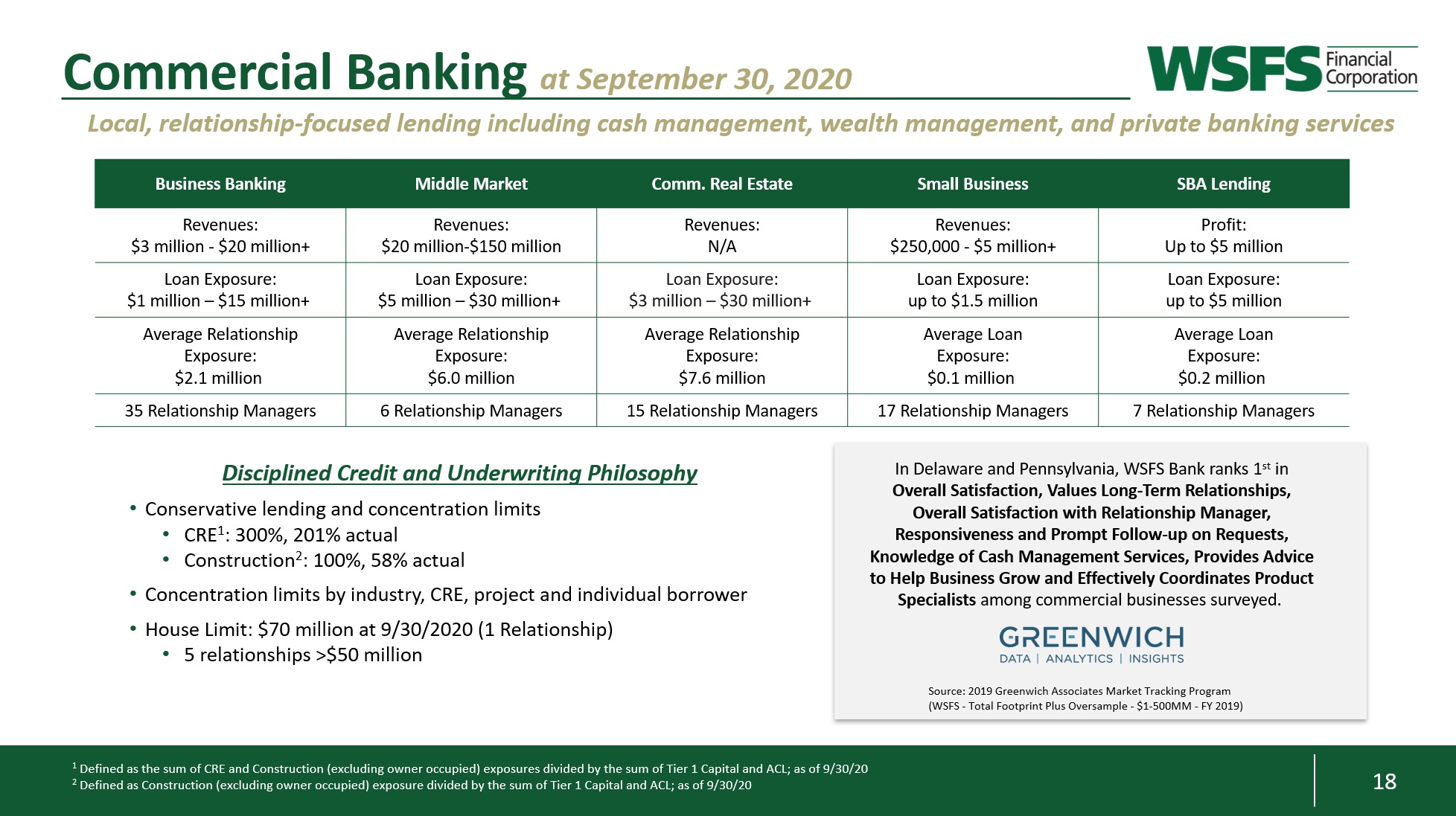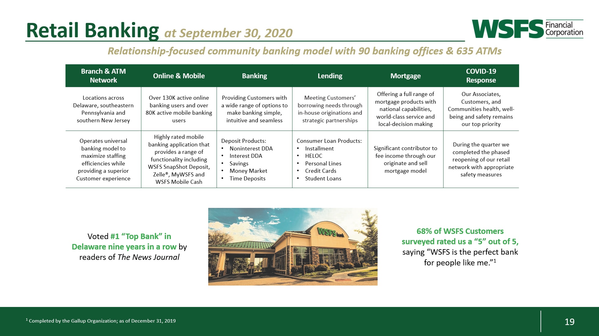18 Disciplined Credit and Underwriting Philosophy • Conservative lending and concentration limits • CRE 1 : 300%, 201% actual • Construction 2 : 100%, 58% actual • Concentration limits by industry, CRE, project and individual borrower • House Limit: $70 million at 9/30/2020 (1 Relationship) • 5 relationships >$50 million Business Banking Middle Market Comm. Real Estate Small Business SBA Lending Revenues: $3 million - $20 million+ Revenues: $20 million - $150 million Revenues: N/A Revenues: $250,000 - $5 million+ Profit: Up to $5 million Loan Exposure: $1 million – $15 million+ Loan Exposure: $5 million – $30 million+ Loan Exposure: $3 million – $30 million+ Loan Exposure: up to $1.5 million Loan Exposure: up to $5 million Average Relationship Exposure: $2.1 million Average Relationship Exposure: $6.0 million Average Relationship Exposure: $7.6 million Average Loan Exposure: $0.1 million Average Loan Exposure: $0.2 million 35 Relationship Managers 6 Relationship Managers 15 Relationship Managers 17 Relationship Managers 7 Relationship Managers Local, relationship - focused lending including cash management, wealth management, and private banking services In Delaware and Pennsylvania, WSFS Bank ranks 1 st in Overall Satisfaction, Values Long - Term Relationships, Overall Satisfaction with Relationship Manager, Responsiveness and Prompt Follow - up on Requests, Knowledge of Cash Management Services, Provides Advice to Help Business Grow and Effectively Coordinates Product Specialists among commercial businesses surveyed. Source: 2019 Greenwich Associates Market Tracking Program (WSFS - Total Footprint Plus Oversample - $1 - 500MM - FY 2019) 1 Defined as the sum of CRE and Construction (excluding owner occupied) exposures divided by the sum of Tier 1 Capital and ACL; a s of 9/30/20 2 Defined as Construction (excluding owner occupied) exposure divided by the sum of Tier 1 Capital and ACL; as of 9/30/20 Commercial Banking at September 30, 2020
