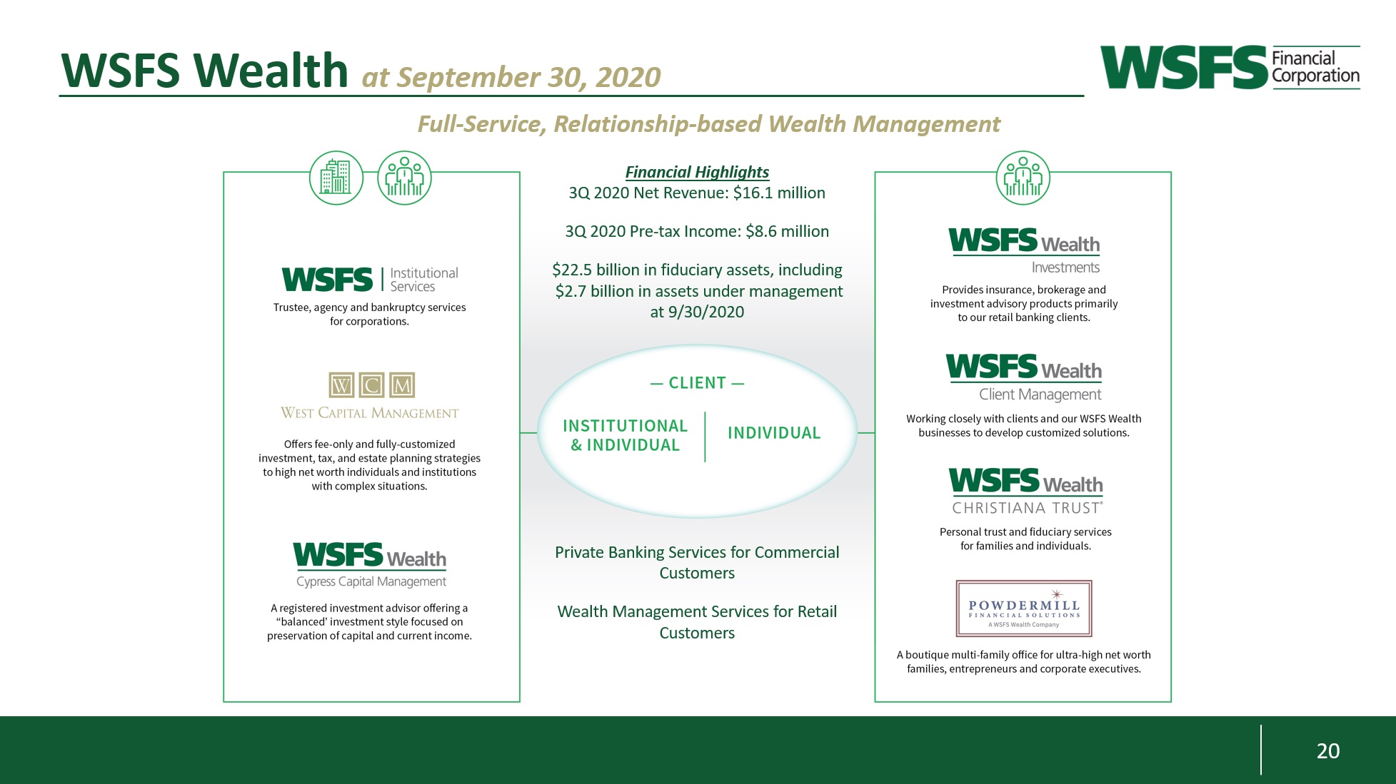 19 Branch & ATM Network Online & Mobile Banking Lending Mortgage COVID - 19 Response Locations across Delaware, southeastern Pennsylvania and southern New Jersey Over 130K active online banking users and over 80K active mobile banking users Providing Customers with a wide range of options to make banking simple, intuitive and seamless Meeting Customers’ borrowing needs through in - house originations and strategic partnerships Offering a full range of mortgage products with national capabilities, world - class service and local - decision making Our Associates, Customers, and Communities health, well - being and safety remains our top priority Operates universal banking model to maximize staffing efficiencies while providing a superior Customer experience Highly rated mobile banking application that provides a range of functionality including WSFS SnapShot Deposit, Zelle®, MyWSFS and WSFS Mobile Cash Deposit Products: • Noninterest DDA • Interest DDA • Savings • Money Market • Time Deposits Consumer Loan Products: • Installment • HELOC • Personal Lines • Credit Cards • Student Loans Significant contributor to fee income through our originate and sell mortgage model During the quarter we completed the phased reopening of our retail network with appropriate safety measures 1 Completed by the Gallup Organization; as of December 31, 2019 68% of WSFS Customers surveyed rated us a “5” out of 5, saying “WSFS is the perfect bank for people like me.” 1 Voted #1 “Top Bank” in Delaware nine years in a row by readers of The News Journal Relationship - focused community banking model with 90 banking offices & 635 ATMs Retail Banking at September 30, 2020