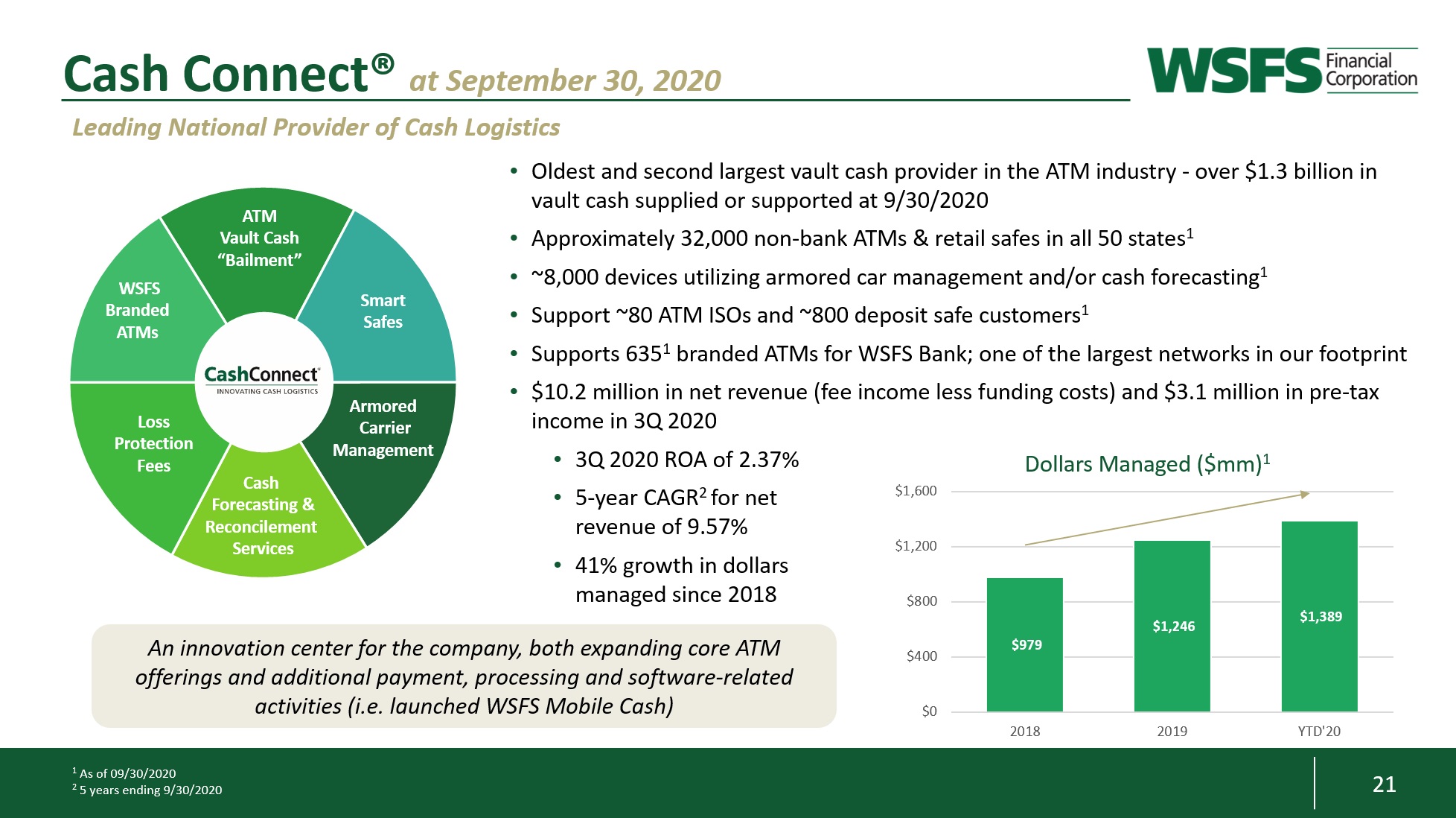 20 WSFS Wealth at September 30, 2020 Private Banking Services for Commercial Customers Wealth Management Services for Retail Customers Financial Highlights 3Q 2020 Net Revenue: $16.1 million 3Q 2020 Pre - tax Income: $8.6 million $22.5 billion in fiduciary assets, including $2.7 billion in assets under management at 9/30/2020 Full - Service, Relationship - based Wealth Management