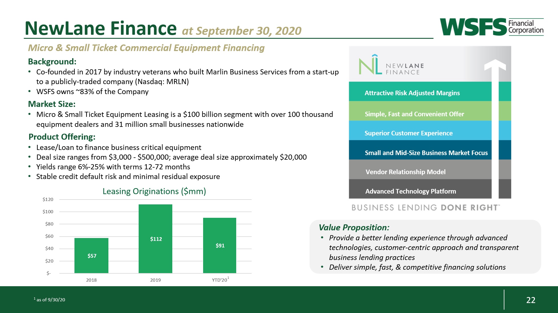 22 NewLane Finance at September 30, 2020 Background: • Co - founded in 2017 by industry veterans who built Marlin Business Services from a start - up to a publicly - traded company (Nasdaq: MRLN) • WSFS owns ~83% of the Company Market Size: • Micro & Small Ticket Equipment Leasing is a $100 billion segment with over 100 thousand equipment dealers and 31 million small businesses nationwide Product Offering: • Lease/Loan to finance business critical equipment • Deal size ranges from $3,000 - $500,000; average deal size approximately $20,000 • Yields range 6% - 25% with terms 12 - 72 months • Stable credit default risk and minimal residual exposure Vendor Relationship Model Small and Mid - Size Business Market Focus Advanced Technology Platform Superior Customer Experience Simple, Fast and Convenient Offer Attractive Risk Adjusted Margins Micro & Small Ticket Commercial Equipment Financing Value Proposition: • Provide a better lending experience through advanced technologies, customer - centric approach and transparent business lending practices • Deliver simple, fast, & competitive financing solutions $57 $112 $91 $- $20 $40 $60 $80 $100 $120 2018 2019 YTD'20 Leasing Originations ($mm) 1 as of 9/30/20 1