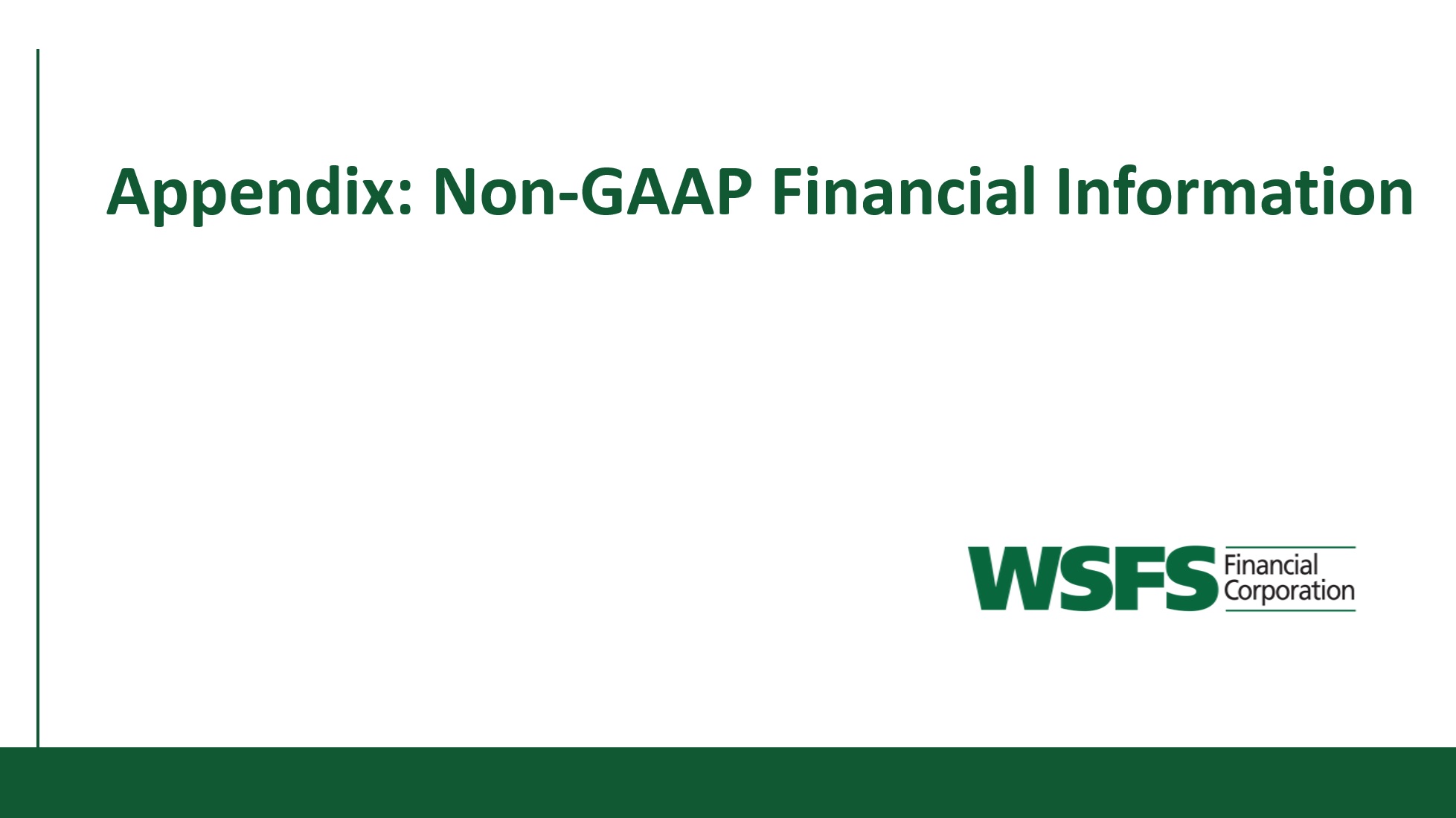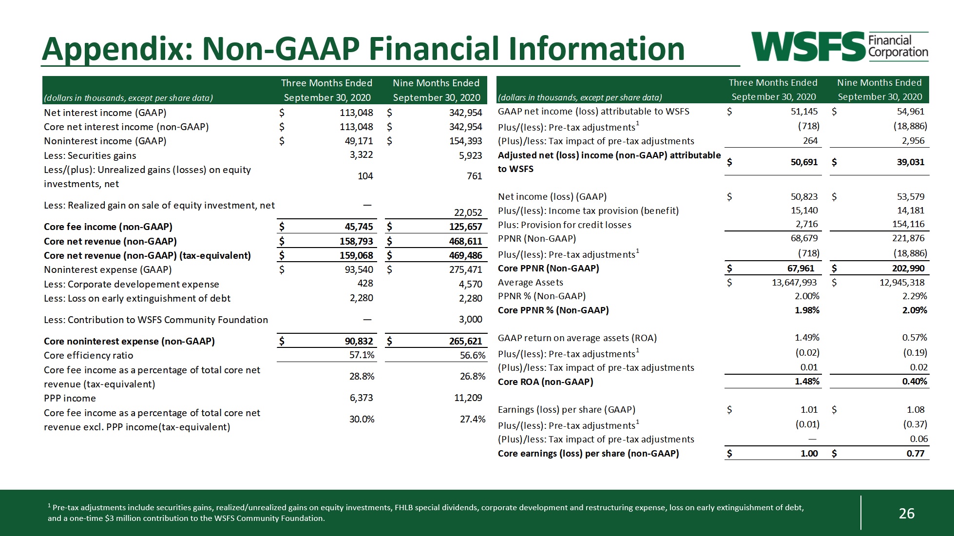 25 Appendix: Non - GAAP Information This presentation contains financial measures determined by methods other than in accordance with accounting principles generally accepted in the United States (GAAP) . The following are the non - GAAP measures used in this presentation : • Adjusted/Core net income (non - GAAP) is a non - GAAP measure that adjusts net income determined in accordance with GAAP to exclude the impact of certain items as detailed in footnote 1 below ; • Core earnings (loss) per share is a non - GAAP measure that divides ( i ) adjusted net income (non - GAAP) by (ii) weighted average shares of common stock outstanding for the applicable period ; • Core return on average assets (ROA) is a non - GAAP measure that divides ( i ) adjusted net income (non - GAAP) by (ii) average assets for the applicable period ; • Core Net Interest Income is a non - GAAP measure that adjusts net interest income as determined in accordance with GAAP to exclude the impact of FHLB special dividends • Core Net Interest Margin (NIM) is a non - GAAP measure that divides ( i ) core net interest income computed on a tax - equivalent basis by (ii) average interest - earning assets for the applicable period • Core noninterest income, also called core fee income, is a non - GAAP measure that adjusts noninterest income as determined in accordance with GAAP to exclude the impact of securities gains and realized/unrealized gains on equity investments ; • Core fee income % is a non - GAAP measure that is determined by dividing core fee income by core net revenue for the applicable period ; • Core net revenue is a non - GAAP measure that is determined by adding core net interest income plus core fee income ; • Core noninterest expense is a non - GAAP measure that adjusts noninterest expense as determined in accordance with GAAP to exclude corporate development and restructuring expenses, loss on early extinguishment of debt and a one - time $ 3 million contribution to the WSFS Community Foundation ; • Core efficiency ratio is a non - GAAP measure that is determined by dividing core noninterest expense by the sum of core net interest income and core fee income ; • Tangible common equity is a non - GAAP measure and is defined as total average stockholders’ equity less goodwill and intangible assets ; • Return on average tangible common equity (ROTCE) is a non - GAAP measure and is defined as net income allocable to common stockholders divided by tangible common equity ; • Core ROTCE is a non - GAAP measure and is defined as adjusted/core net income allocable to common stockholders divided by tangible common equity ; • Tangible common book value per share is a non - GAAP measure that is equal to common equity less goodwill and intangible assets, divided by total shares outstanding ; • Pre - provision net revenue (PPNR) is a non - GAAP measure that adjusts net income determined in accordance with GAAP to exclude the impact of income tax provision (credit) and provision for credit losses ; • PPNR % is a non - GAAP measure that is determined by dividing PPNR by average assets for the applicable period ; • Core PPNR is a non - GAAP measure that adjusts PPNR by excluding certain pre - tax adjustments 1 for the applicable period ; • Core PPNR % is a non - GAAP measure that is determined by dividing Core PPNR by average assets for the applicable period ; 1 Pre - tax adjustments include securities gains, realized/unrealized gains on equity investments, FHLB special dividends, corporat e development and restructuring expense, loss on early extinguishment of debt, and a one - time $3 million contribution to the WSFS Community Foundation.